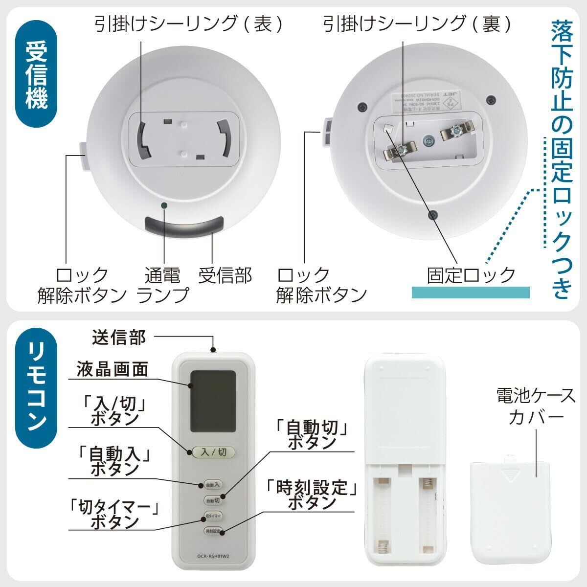 【 特 長 】 ◆赤外線リモコンで離れた場所から照明器具をオン・オフ ◆文字が見やすい大型液晶リモコン ◆毎日同じ時刻に繰り返し「自動オン・オフ」も可能、防犯対策に ◆日照不足の暗い北向き・窓なし部屋での目覚まし照明用にも ◆5時間後まで自動オフができる切タイマー機能付き ◆落下防止の「固定ロック機能」付き ◆通電ランプ付き ◆取り付けは照明器具と天井の引掛シーリングの間に受信機本体をセットするだけ、面倒な配線や工事などの必要なし
