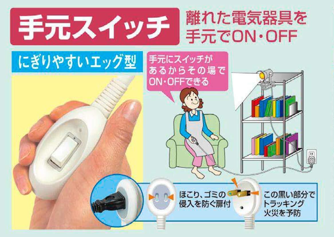 ●手元にスイッチがあるから、その場でON/OFFができる。 ●ほこり、ゴミの侵入を防ぐ扉付。 ●耐トラッキングカバー。 ●よじれにくいだ円形状コード。