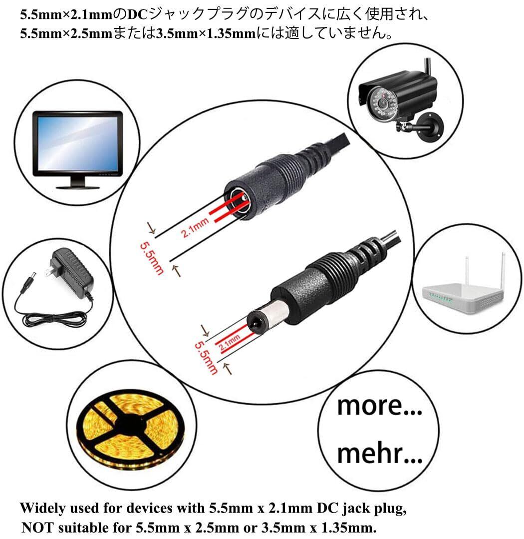 LEDストリップ、CCTVカメラ、セキュリティDVR、車、ボート、モニター、プリンター、センサーなどに広く使用されています。DCジャックプラグサイズが5.5mm x 2.1mmであるかどうかをご確認ください。