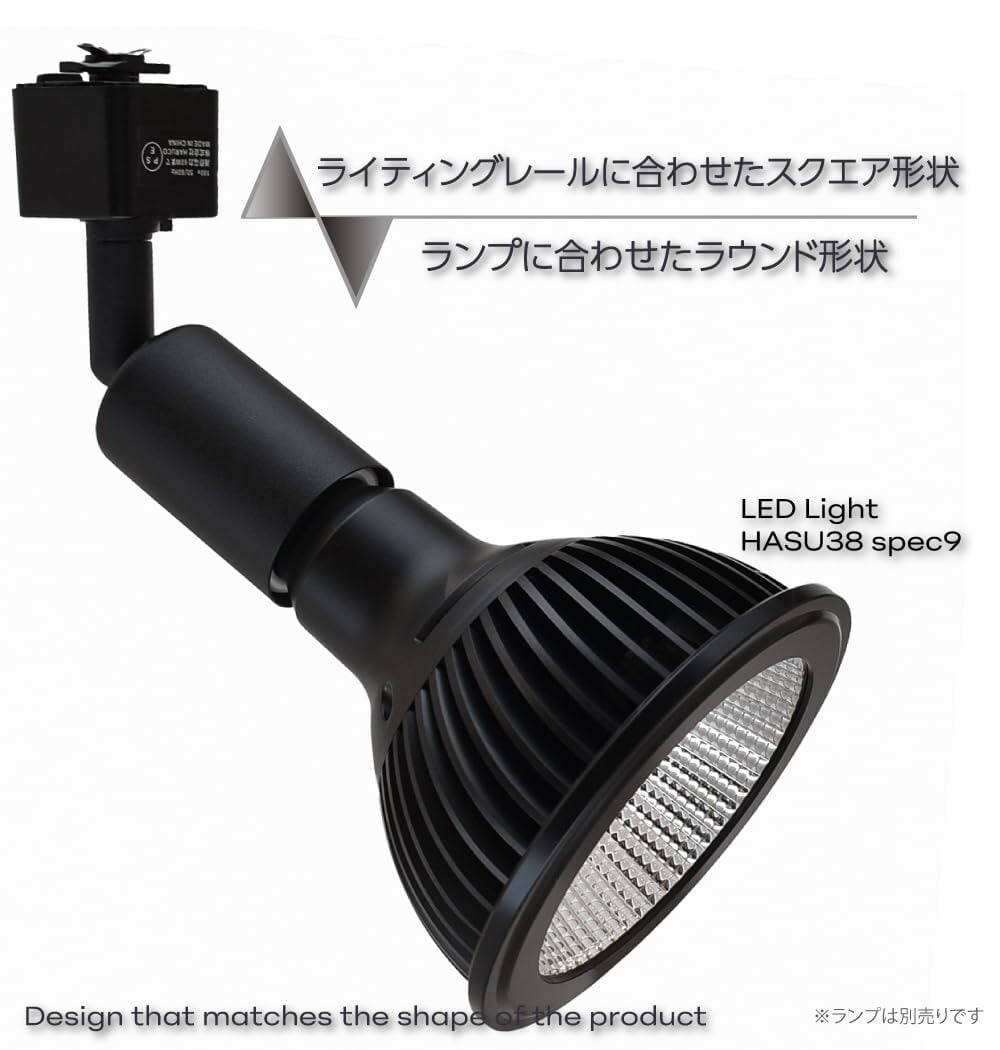 ライトを接続する口金側(ソケット)は円筒型に対してライティングレール側はレール形状に合わせたスクエア型。エンボス調マットブラック色と合わせて質感やデザインにも配慮があります。