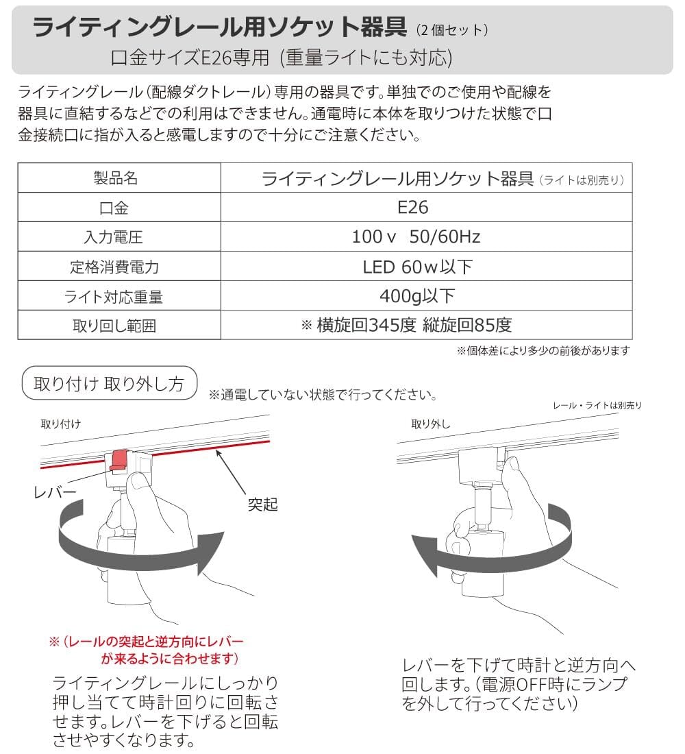 ライティングレール(ダクトレール)専用のソケット(口金サイズE26)2個入り。ライトは含まれません。経済産業省PSE適合製品。製品3年。