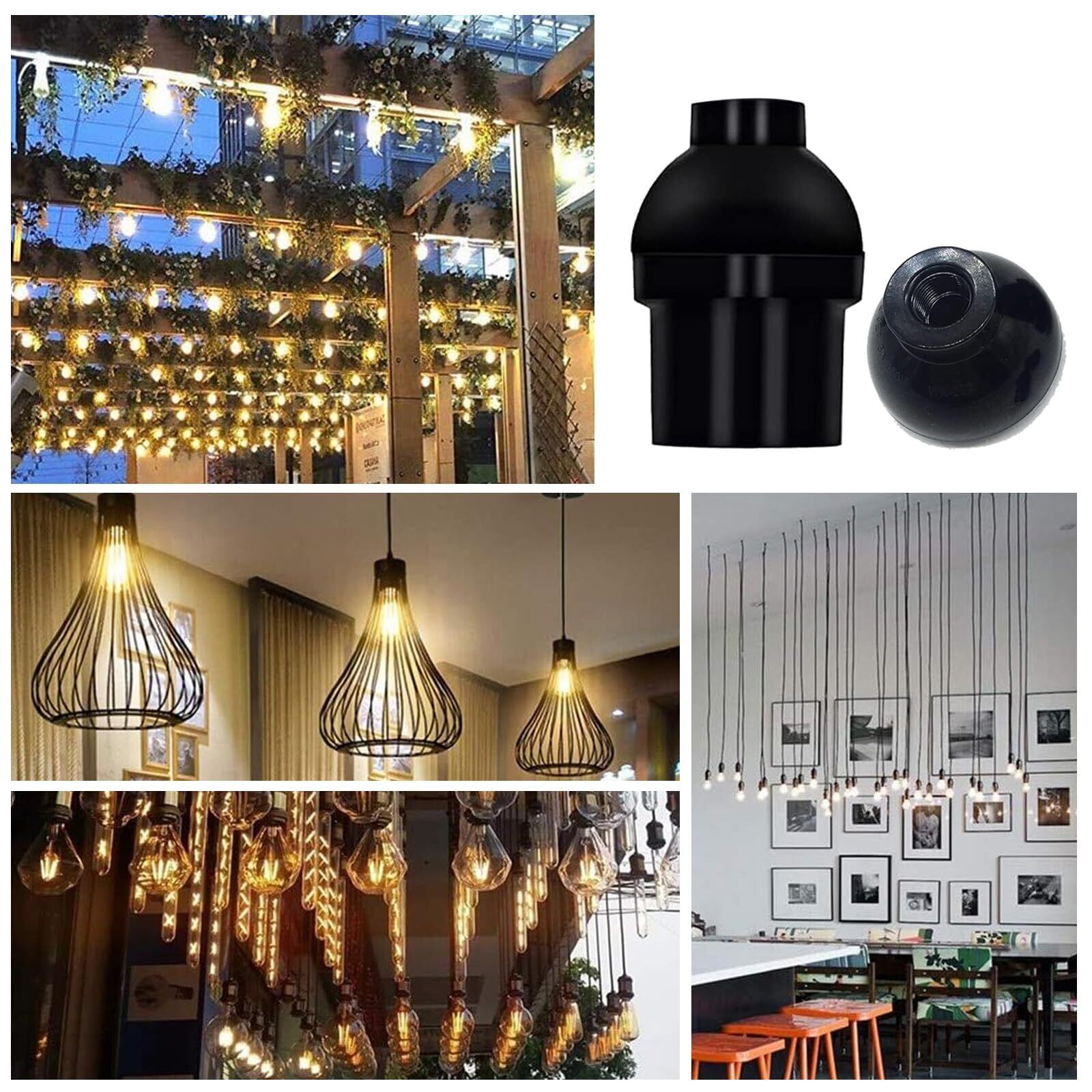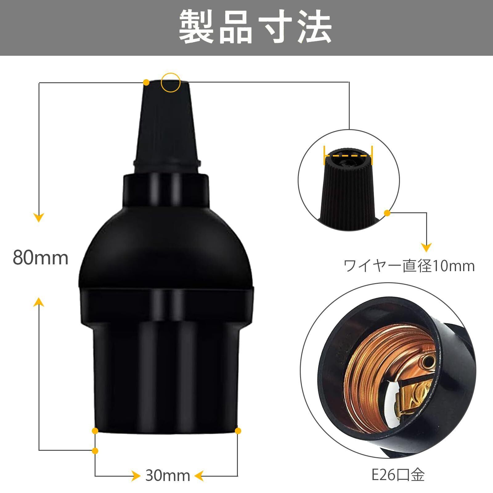 【商品情報】本体サイズ:約幅40*H60mm。連接部品サイズ:約幅15mm*H30mm。重さ:約40g。カラー:ブラック。バッケジ:12個セット。口金:E26。