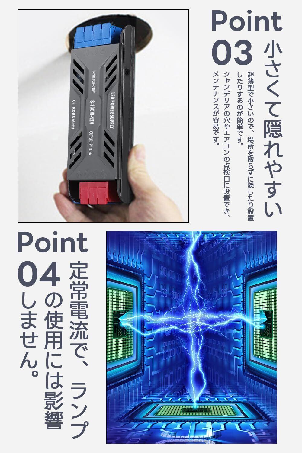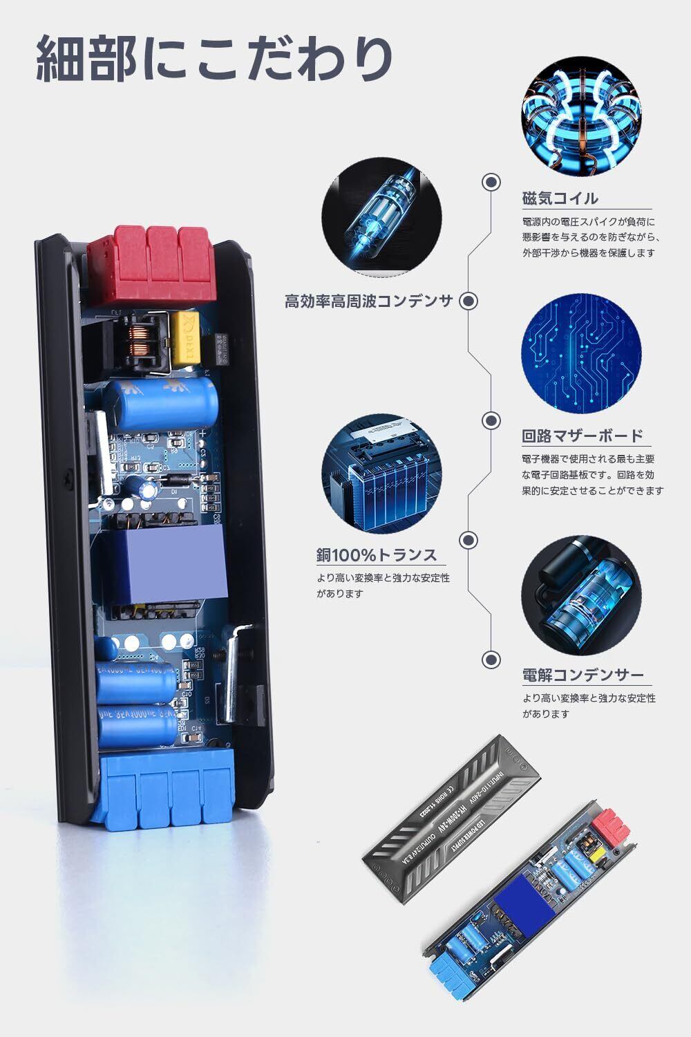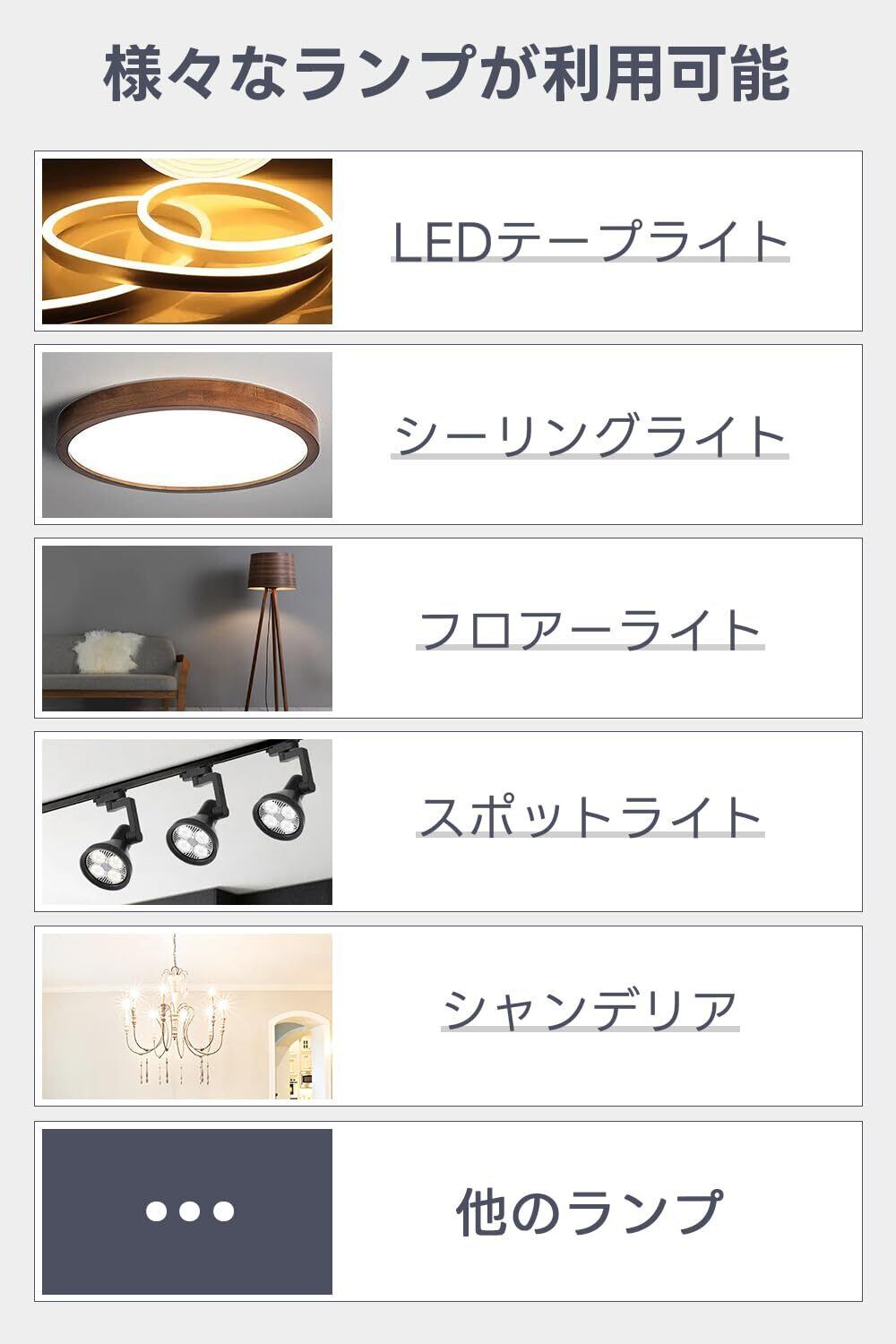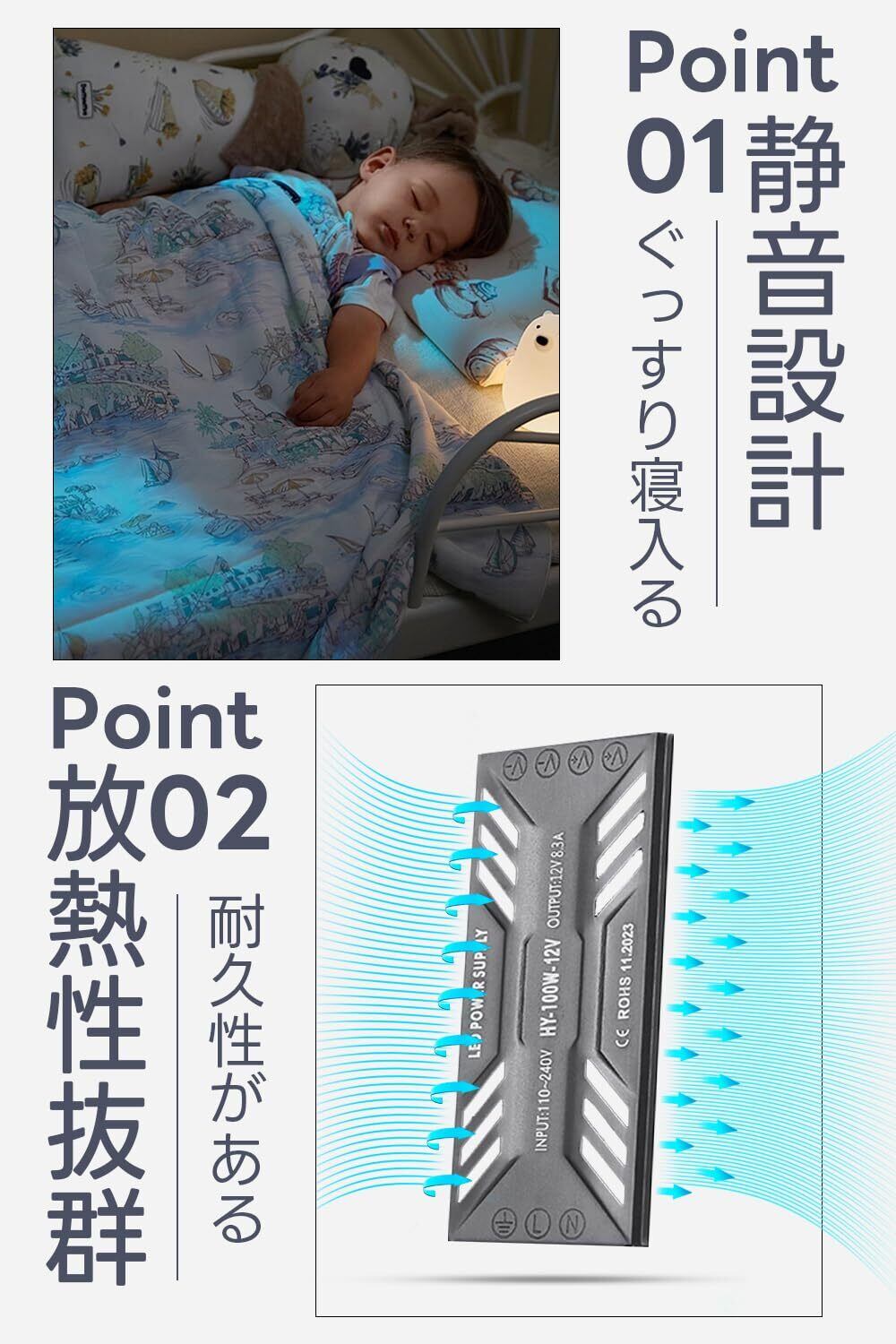 【静音&放熱性抜群】スイッチング電源は熱伝導と熱対流の高いアルミニウムを用い、従来のファンの放熱とは異なります。使用時に安定していて静かで、ファンの騒音もありません。生活空間の静けさと安心を守ります。当製品は保護回路を内蔵して、過電圧、過熱、過負荷に対する保護を提供します。定常電流で、チラツキなし、ランプの使用には影響しません。