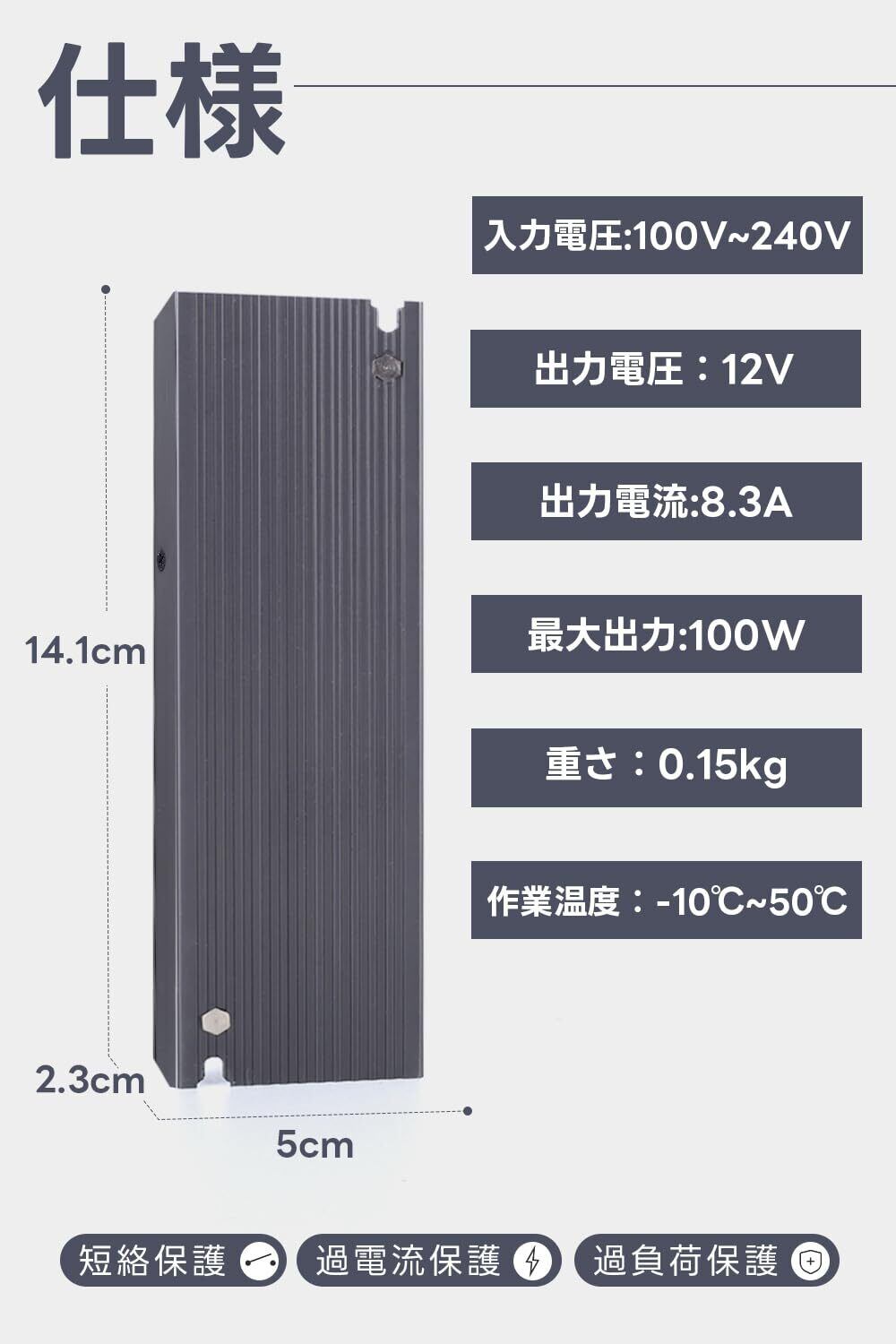 【仕様】入力電圧:100~240V、出力電圧:12V、出力電流:8.3A、最大出力:100W (使用中に損失が発生して,実際出力は約70%)、サイズ:14.1cm*5cm*2.3cm 、重さ:0.15kg 、作業温度:-10°C~50°C 、効率:70% 、調光:不能、防水:不能