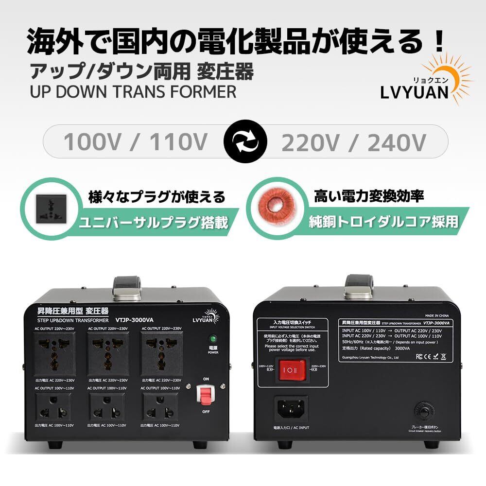 LVYUAN(リョクエン)アップトランス ダウントランス 3000W 海外国内両用型変圧器 降圧・昇圧ポータブルトランス 【220V地域機器対応 変圧器】100V 220V 自由変換 単相 VT-JP3000VA