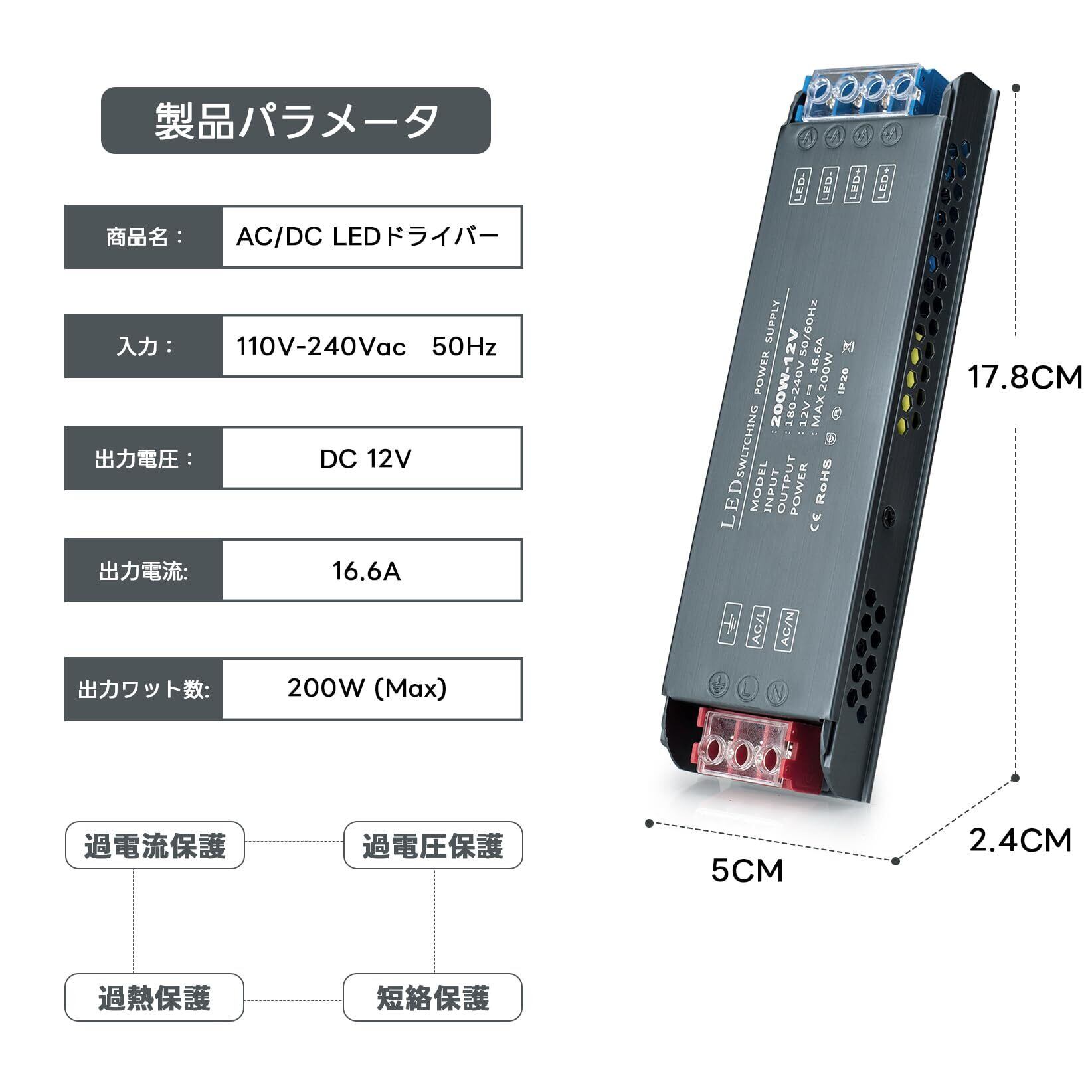 【静かで優れた放熱性】スイッチング電源は、従来のファンの放熱とは異なり、熱伝導率と熱対流が高いアルミニウム製です。 安定して静かで、ファンの音がありません。 生活空間の静けさと安心を守ります。 過電圧、過熱、過負荷に対する保護を提供する保護回路が組み込まれています。 電流は安定しており、ちらつきがなく、ランプの使用に影響を与えません。