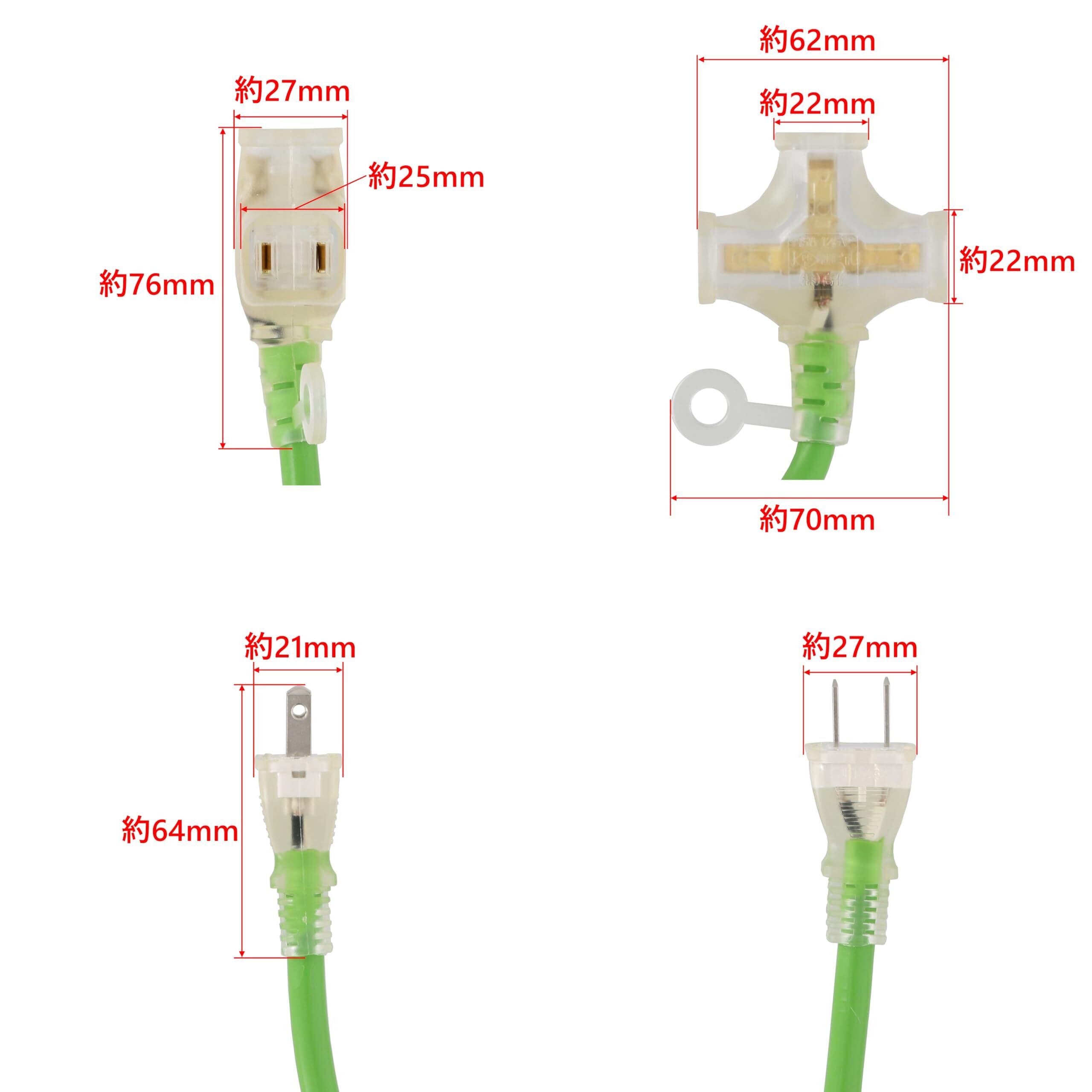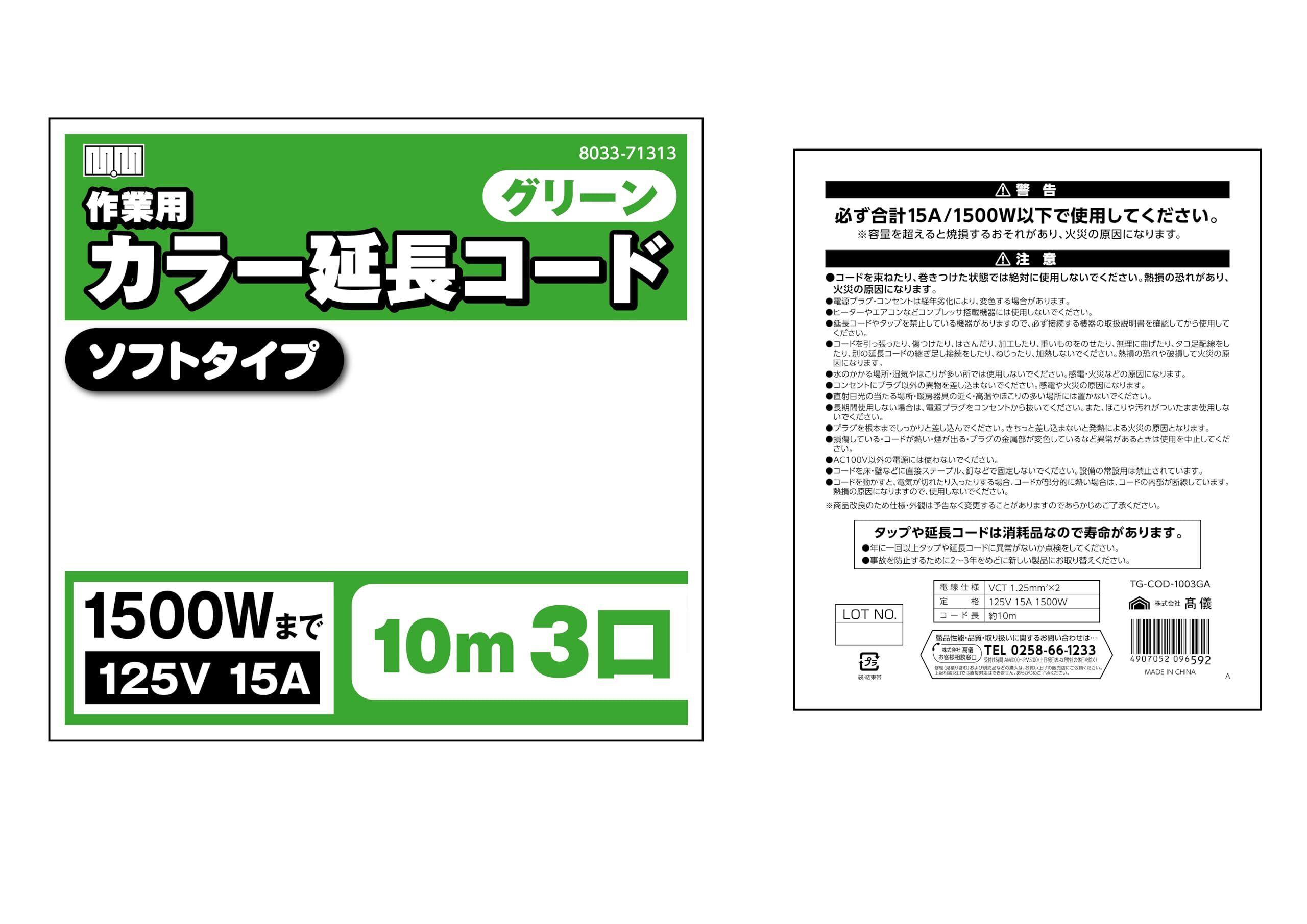 高儀(Takagi) M.M 延長コード 電源タップ トリプルタップ コンセント 電源ケーブル 延長ケーブル 電源コード たこあし 延長電源 ソフトタイプ 3口 1500Wまで 125V 15A 3個口 3分配 電工 作業用 カラー 緑 10m TG-COD-1003GA