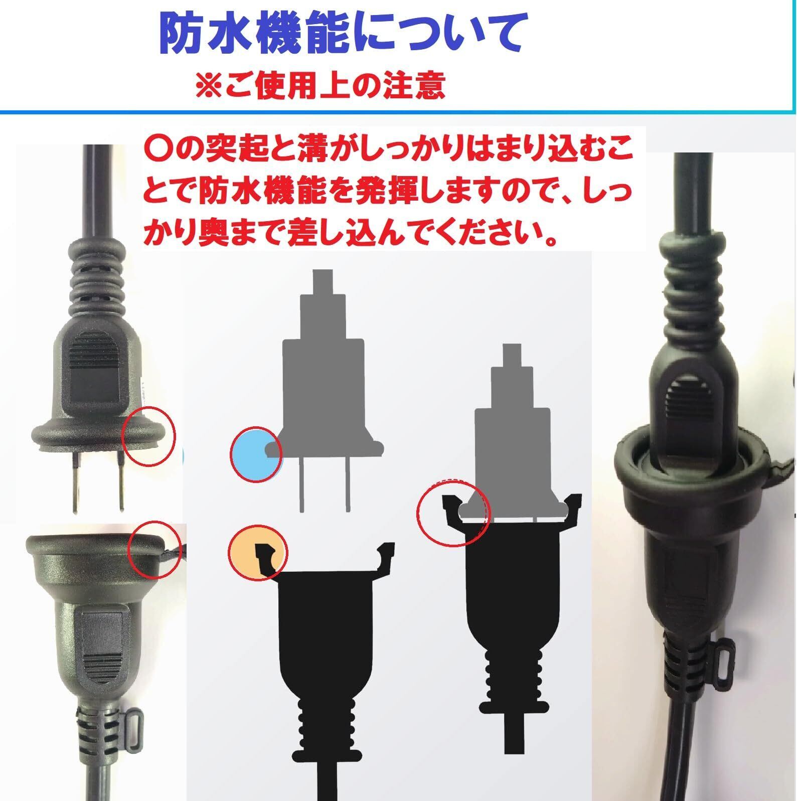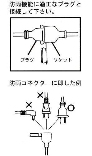 合計1500W以下の容量でご使用ください。 「防雨機能」が有効となるのは、ご使用される機器側も「*防雨対応の電源プラグ」である場合に限ります。(画像をご参照ください) *防雨対応プラグとは直径約3.7cm位の円形のプラグです。 本品は『防雨仕様』であり、完全防水製品ではございませんので、大量の水が掛かる場所や水中ではご使用しないでください。