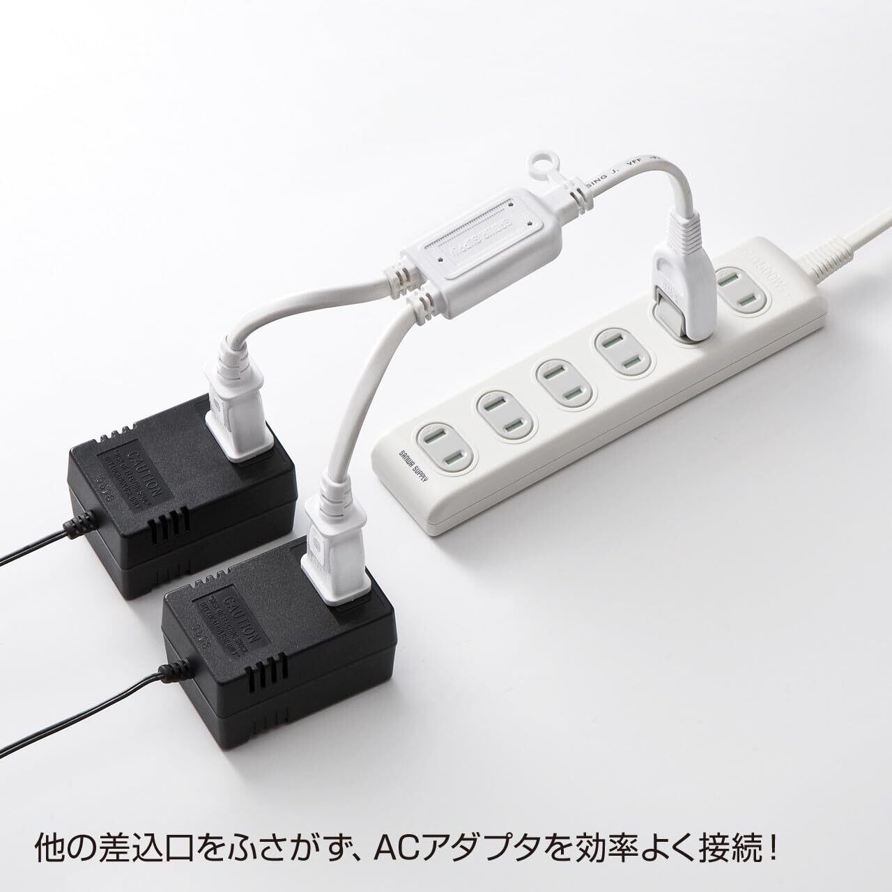 ●他の差込口をふさがないため、ACアダプタ使用時に無駄なく設置できる2分岐タイプの電源延長コードです。