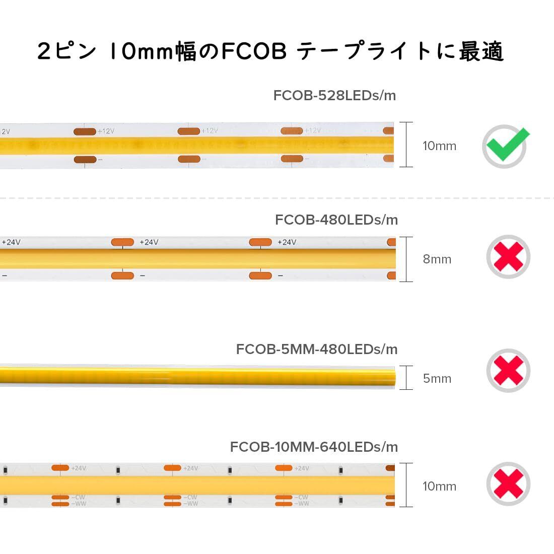 互換性:10mm 2ピンコネクターは、10mm 2ピンCOB LEDテープライトにのみ適しており、他のタイプのテープライト、3ピン/4ピン/5ピン/6ピンFCOB LEDテープライトには適していません。また、通常の単色テープライト、SMD/5050 RGB LEDテープライトには適合しません。