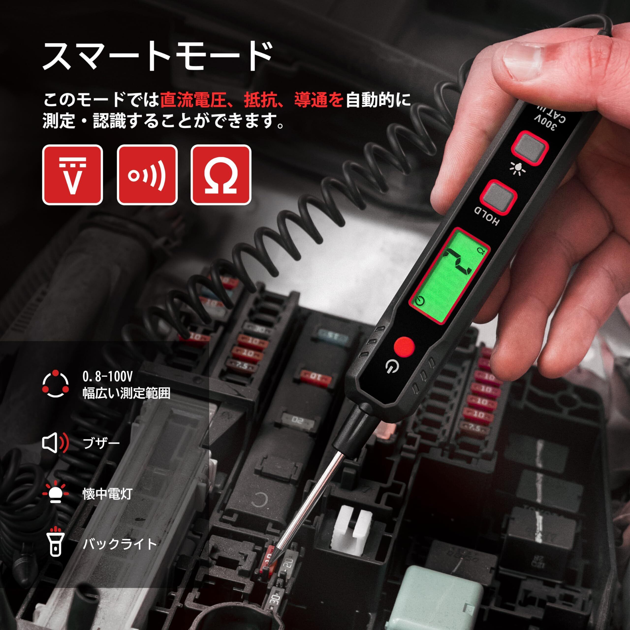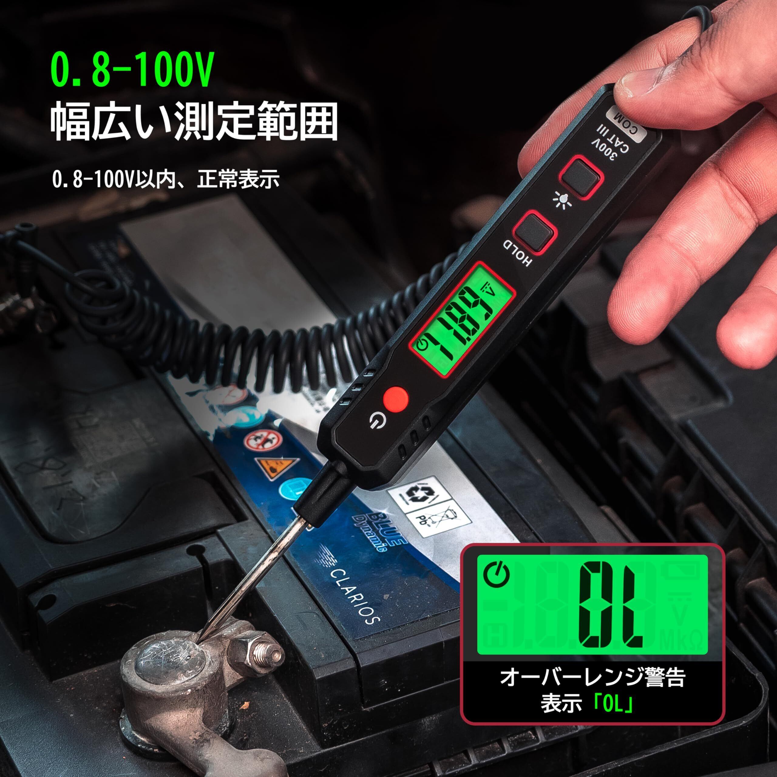 【DC0.8V-100V検電範囲】0.8-100V直流電圧の計測範囲を持つ自動車用回路テスターはオートバイ、軽自動車、トラックなどの車型の電気回路の検査に最適です。最大100VのDC電圧測定が可能で、一般的な自動車用電気テスターの最大電圧60Vを凌駕しています。自動車用ヘッドライト、テールライト、方向指示器回路、ヒューズ接続、その他0.8-100V DC配線および回路の高速測定が可能になります。