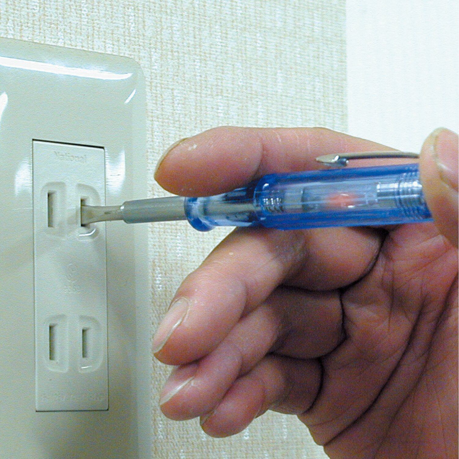 ドライバーの先端をコンセントや電気回路のライン側 (アースではない方) に接触させて、ハンドルの頭部を指で押さえれば、内部に組み込まれた ネオン管が点灯します。