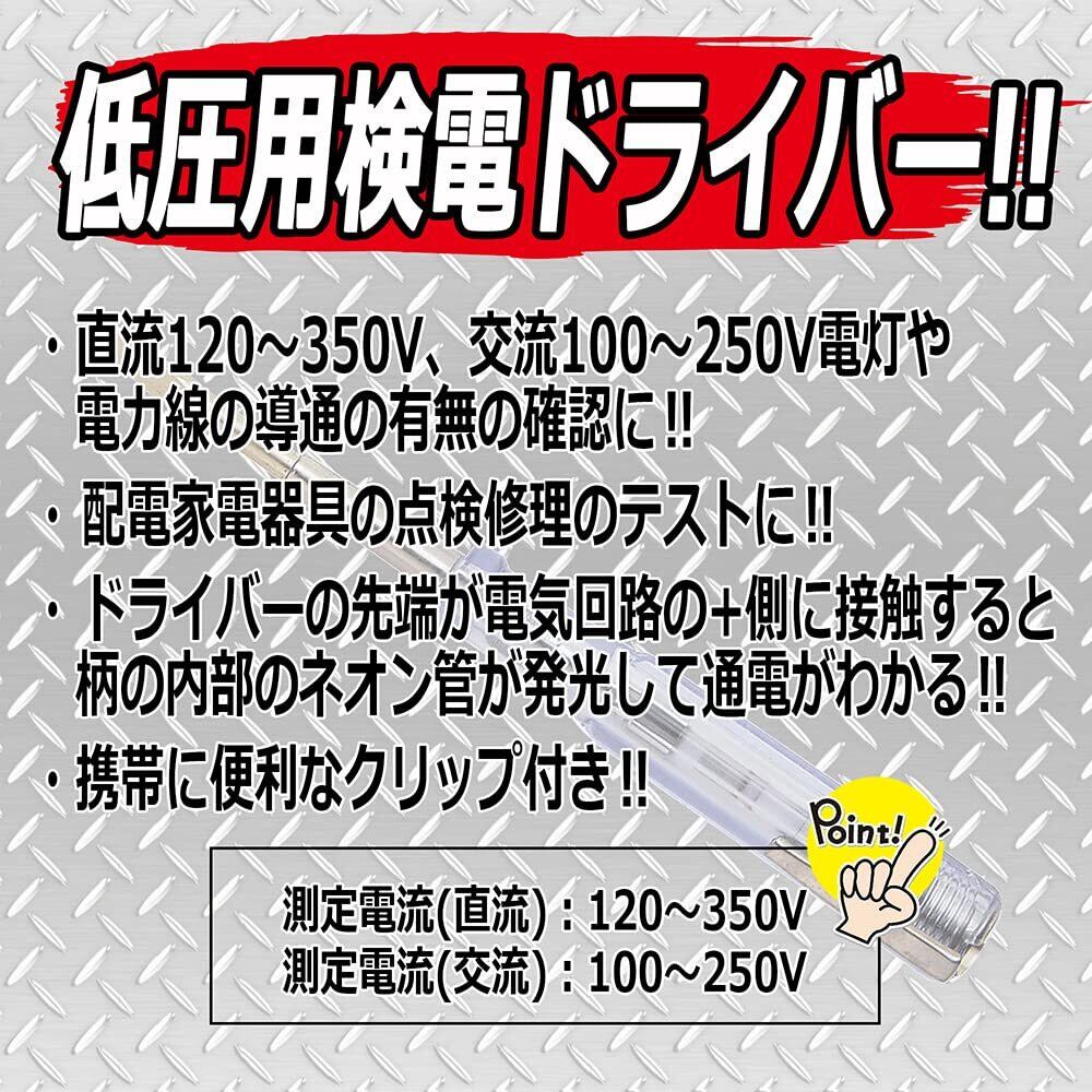 低圧用検電ドライバー直流120~350V、交流100~250V電灯、電力線の導通の有無、配電家電器具の点検、修理にテスター代わりに使用できる