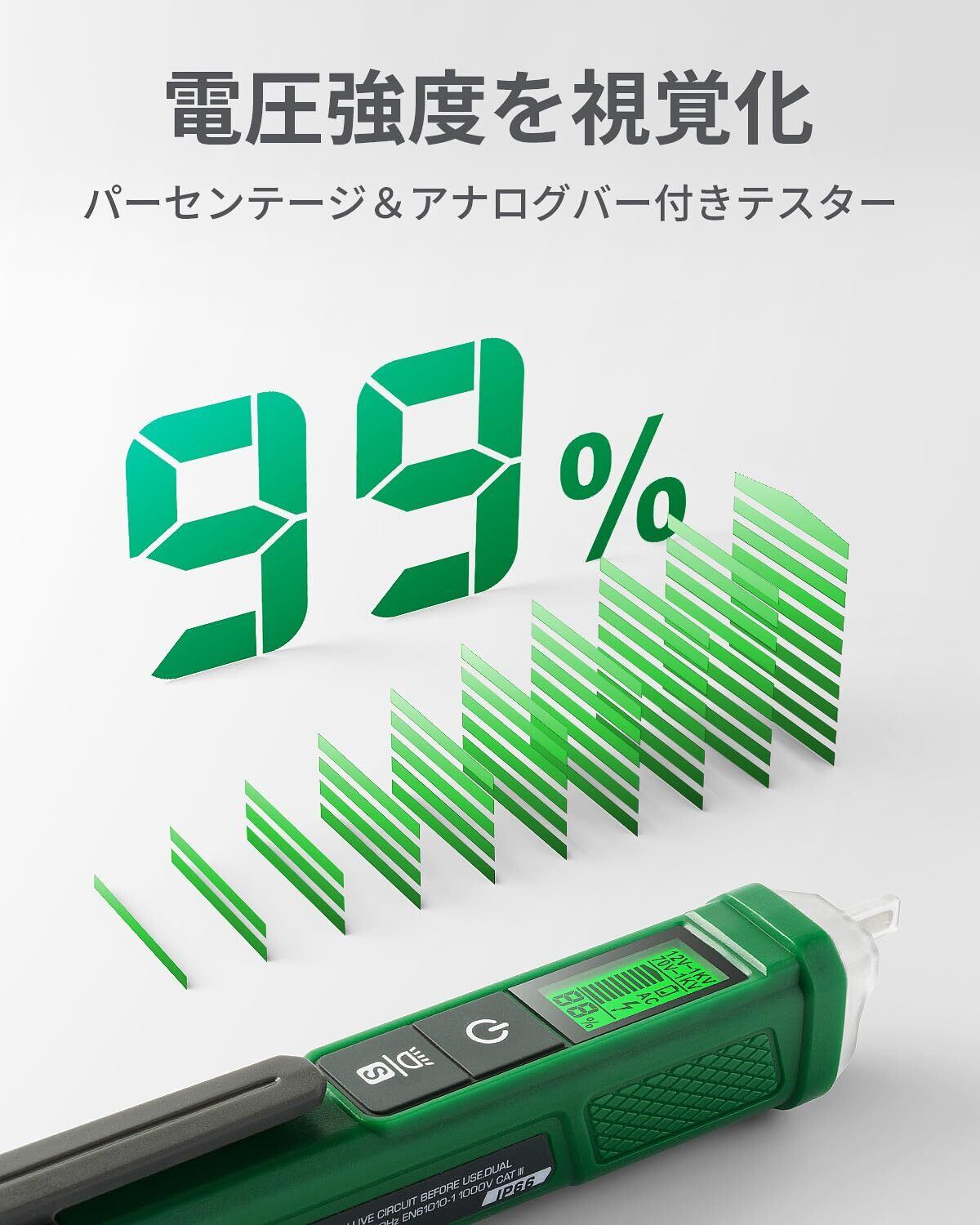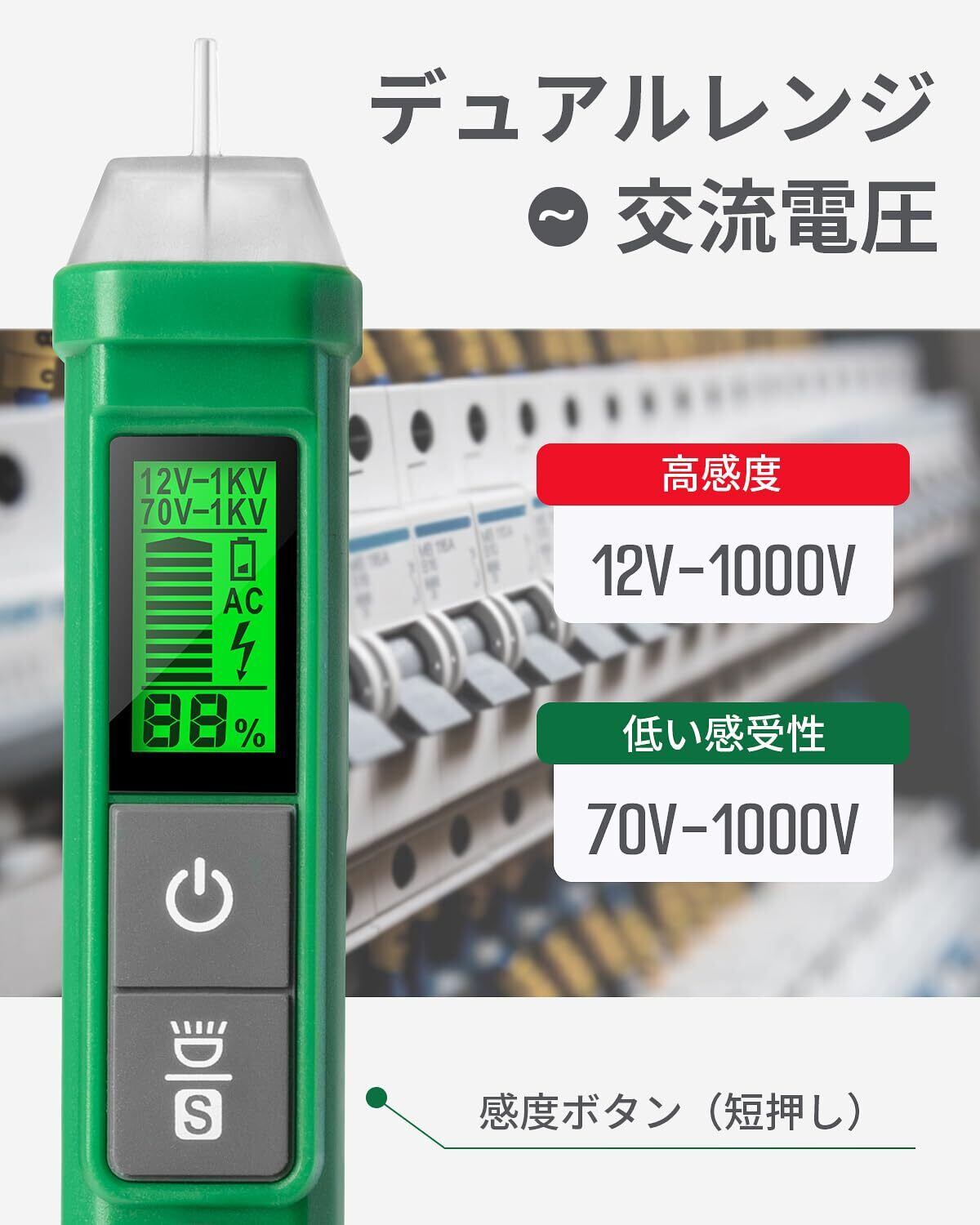 検電器, TESMEN TN-213 ペン型非接触電圧検出器 電気テスター AC 12V-/70V-1000V デュアルレンジ LCDディスプレイ パーセント表示 ブザーアラーム ライブワイヤテスター 断線検知器 - 緑