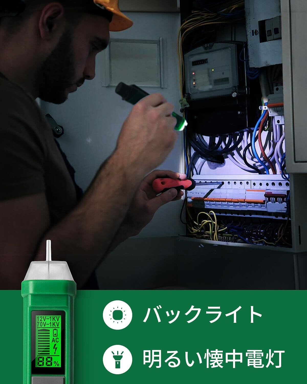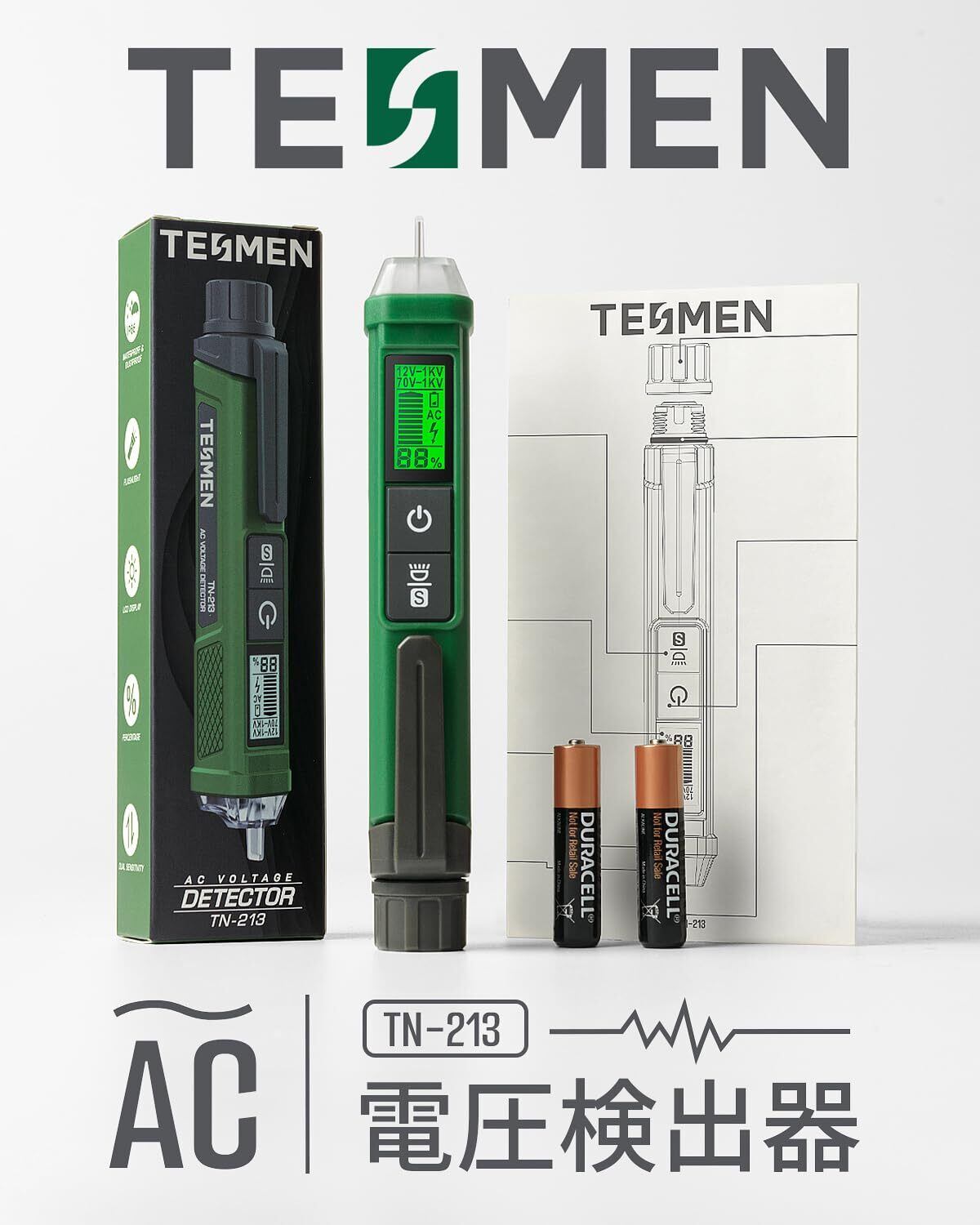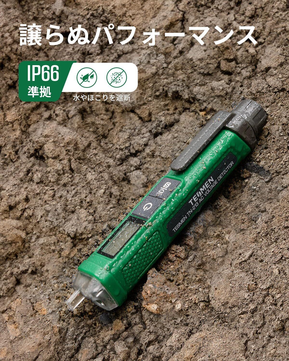 【人気商品】検電器, TESMEN TN-213 ペン型非接触電圧検出器 電気テスター AC 12V-/70V-1000V デュアルレンジ LCDディスプレイ パーセント表示 ブザーアラーム ライブワイヤテスター 断線検知器 - 緑