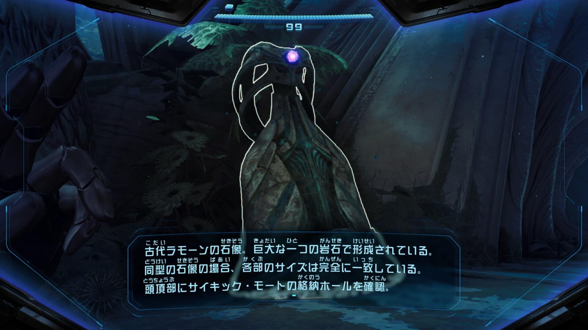 サムスの視点で360度に広がる世界を探索。石像や遺跡をスキャンして情報を入手したり、襲い掛かる異形の生物と戦ったりと、惑星から生きて帰還するために、自分の進むべき道を探っていきます。