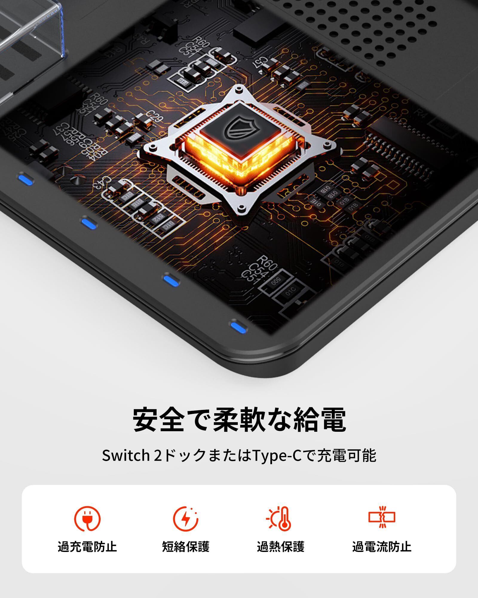 ️【安全·充電保護】対応任天堂スイッチ2 コントローラー 充電設計,本製品のswitch 2 充電ドックは、過充電・過電流・過放電をリアルタイム検知するインテリジェントチップを内蔵。異常時は自動停止、夜間放置時もswitch 2 リモコンの寿命を保護します。