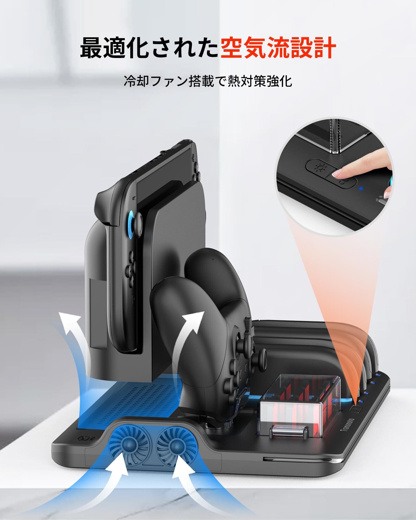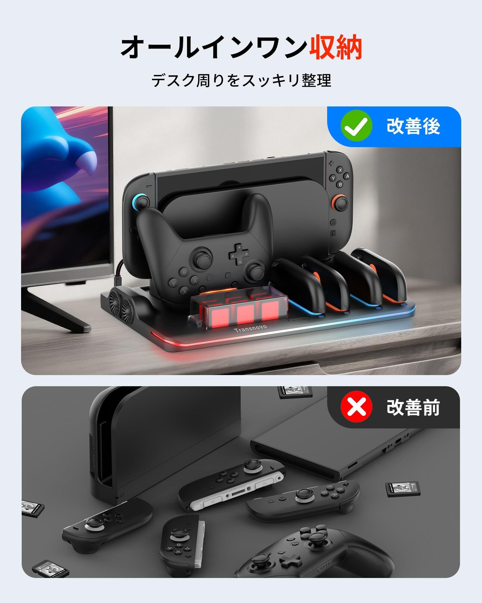 【限定セール】【2025革新的 6 In 1 排熱&充電&収納】TRANSNOVO Switch 2 Pro & ジョイコン対応冷却充電器 ニンテンドースイッチ2対応 3H急速充電スタンド 排熱ファン内蔵 磁着式Joy Con4台+Pro冷却风扇コントローラードック 9枚ゲームカード収納 LED充電指示ランプ&9つのRGB ライト付き 一体型 Type-Cケーブル付属 日本語取扱説明書 (黒)