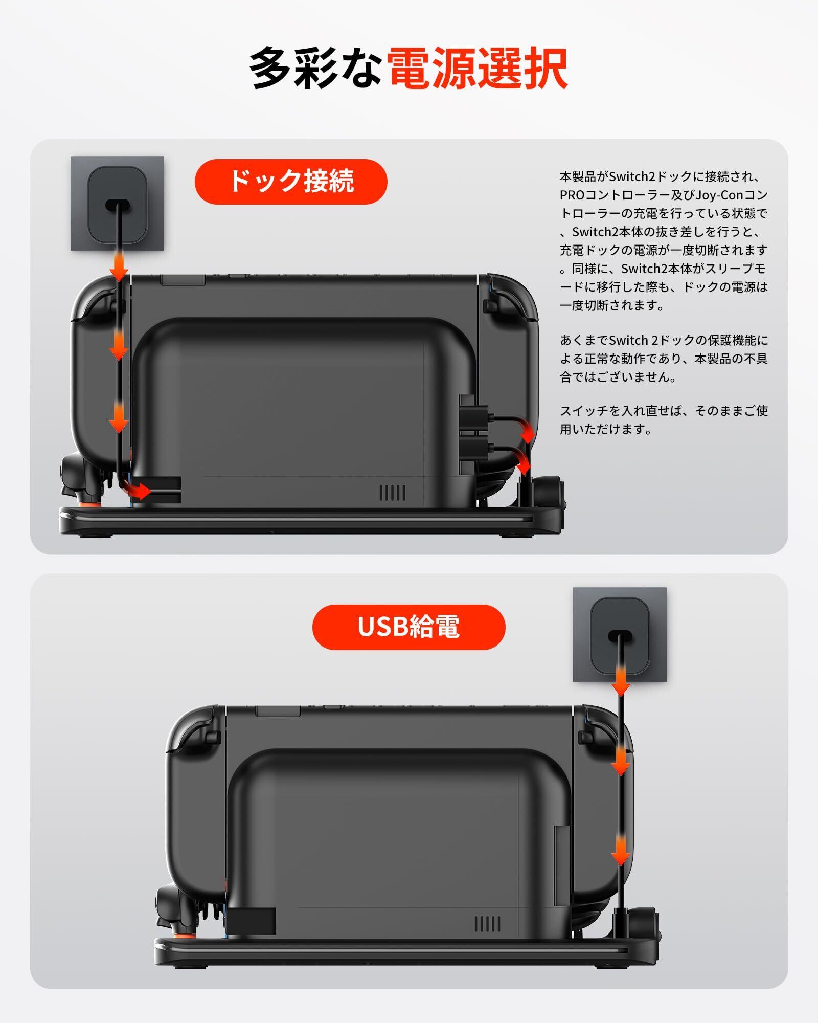 【特別なご説明】本製品がSwitch2ドックに接続され、PROコントローラー及びJoy Conコントローラーの充電を行っている状態で、Switch2本体の抜き差しを行うと、充電ドックの電源が一度切断されます。同様に、Switch2本体がスリープモードに移行した際も、ドックの電源は一度切断されます。 あくまでSwitch 2ドックの保護機能による正常な動作であり、本製品の不具合ではございません。 スイッチを入れ直せば、そのままご使用いただけます。