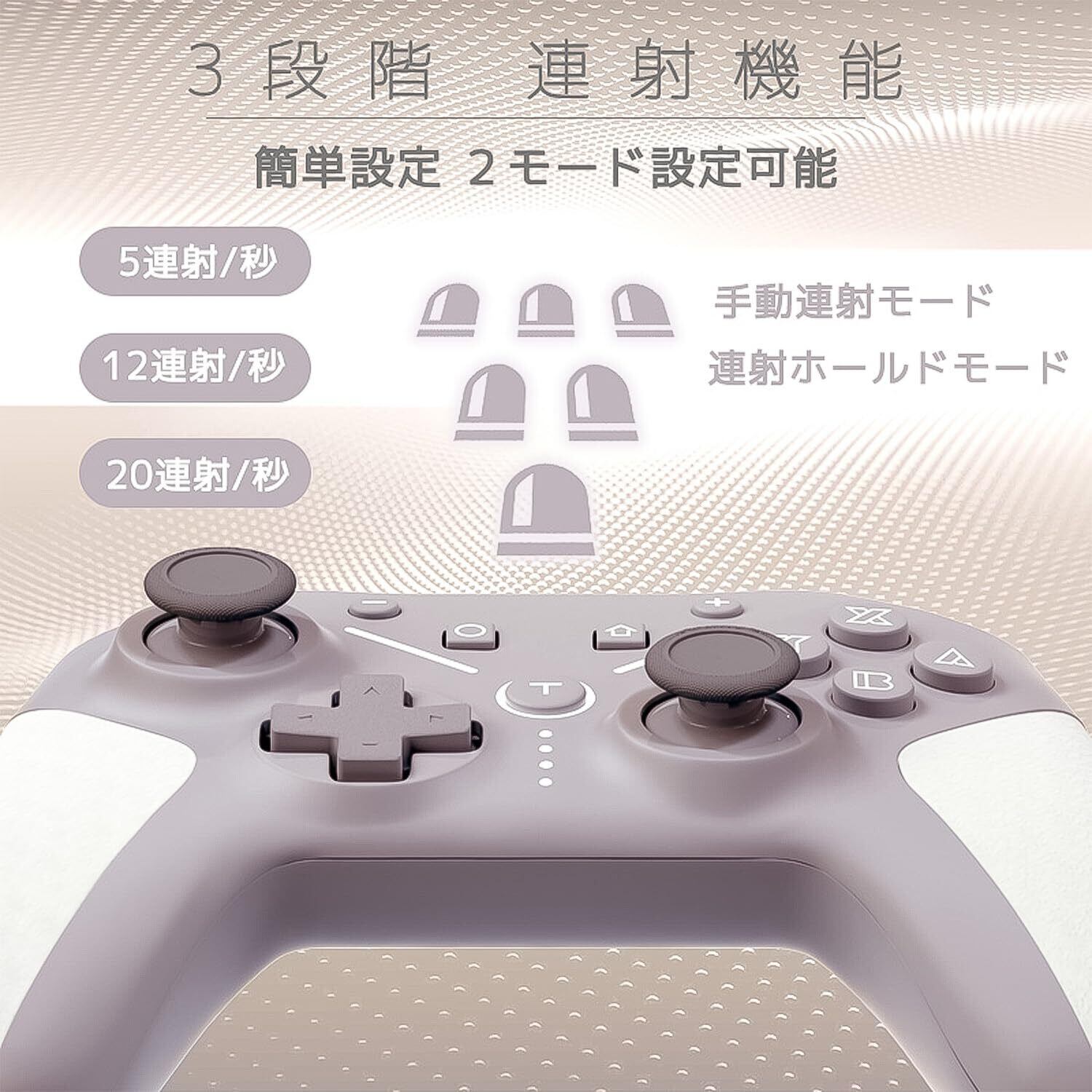 【性能のこだわり】●高精度ボタン:瞬時の反応を実現。スムーズな操作でゲームプレイをより快適に!●3段階連射機能:3段階連射機能搭載(5連射/秒、12連射/秒、20連射/秒)手動連射モードと連射ホールドモードの2つのモードで、あなたのゲームスタイルに合わせたカスタマイズが可能。●6軸ジャイロセンサー:より直感的な操作が可能。精密な動きをキャッチし、リアルなゲーム体験を提供します。●4段階 振動調整:振動調整でゲームの臨場感をカスタマイズ。自分好みの振動強度でプレイを楽しめます。