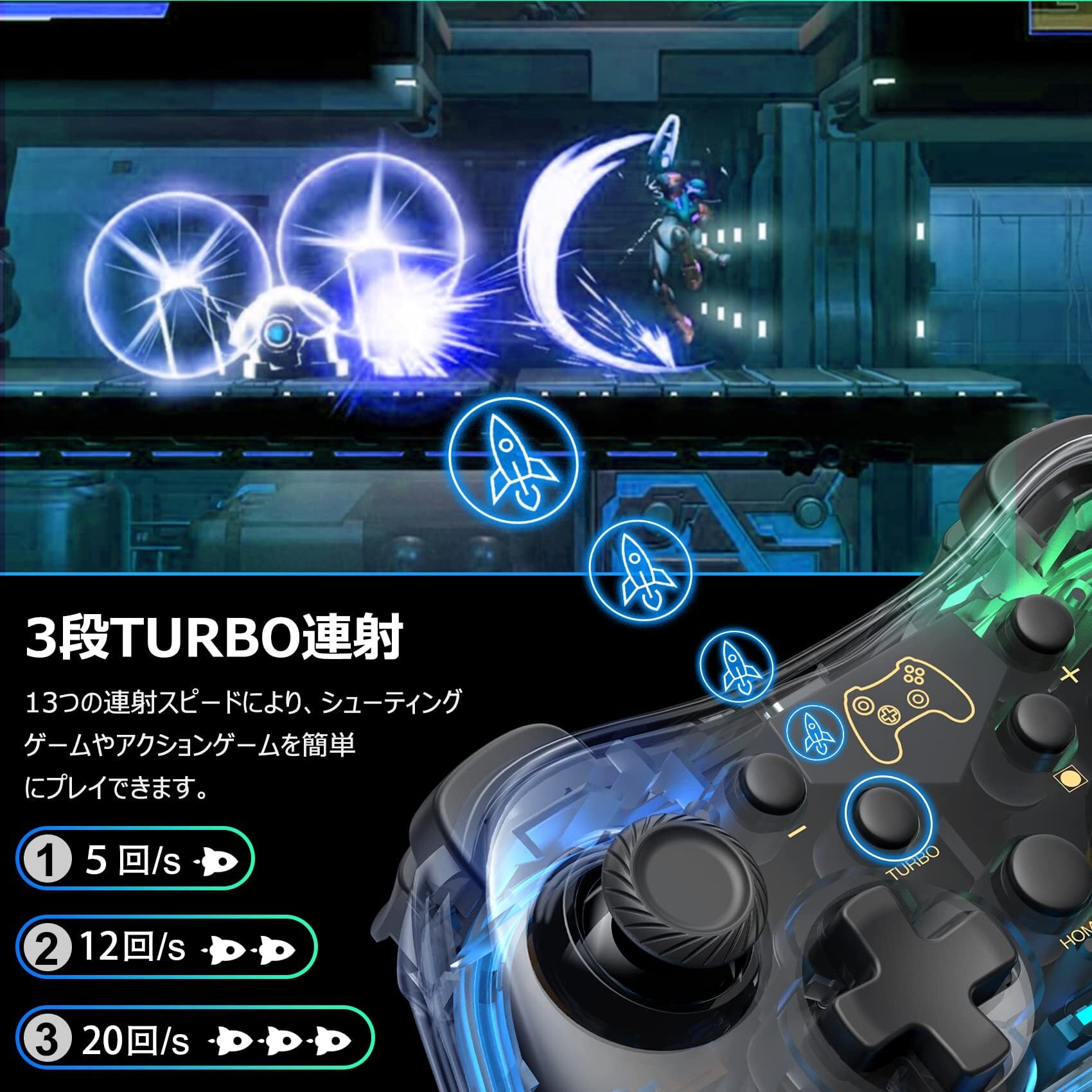 【3段TURBO連射&透明デザイン】スイッチ コントローラーはTURBO連射機能を搭載し、3段速度(4回/秒、8回/秒、16回/秒)を自由に切り替えられ、格闘系ゲームなら、是非この連射機能を利用すれば、勝率をアップさせましょう!透明な材料で作られた外観、コントローラー内部をはっきりと見ることができ、かつてないゲーム体験をもたらします。