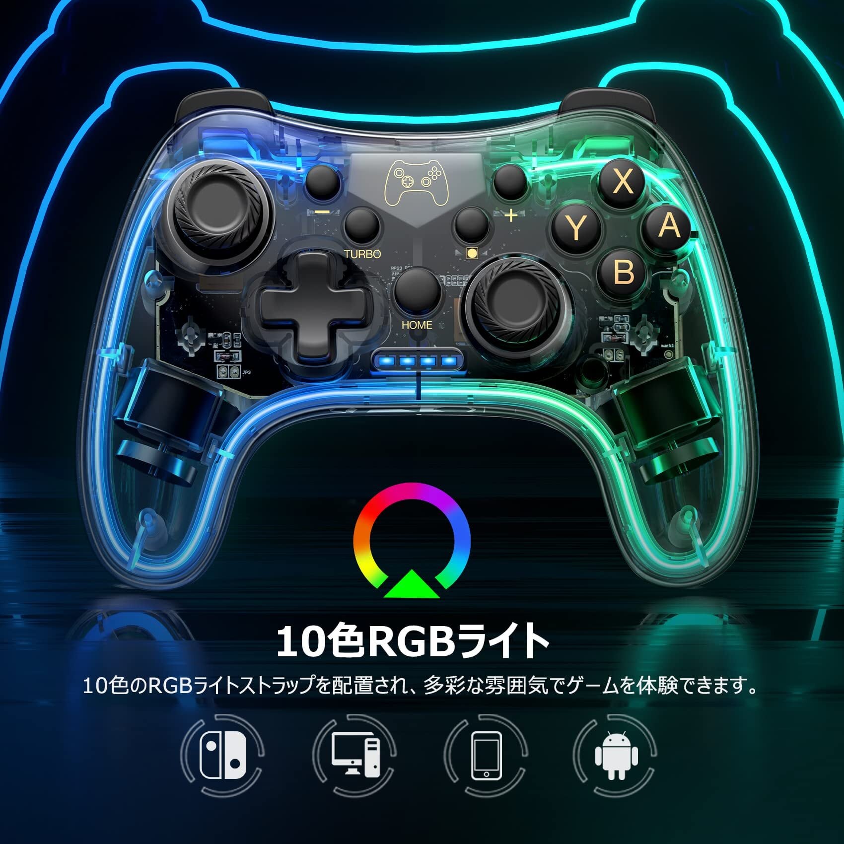 Elekasumi Switch コントローラー 光る【Switch1/2代対応】10色RGBライト スイッチ コントローラー 無線 アプリ設定 TURBO連射 6軸ジャイロセンサー pro コントロー ラー Bluetooth接続 Switc hプロコン Switch全世代に対応PC/Android/IOSに適用 透明色