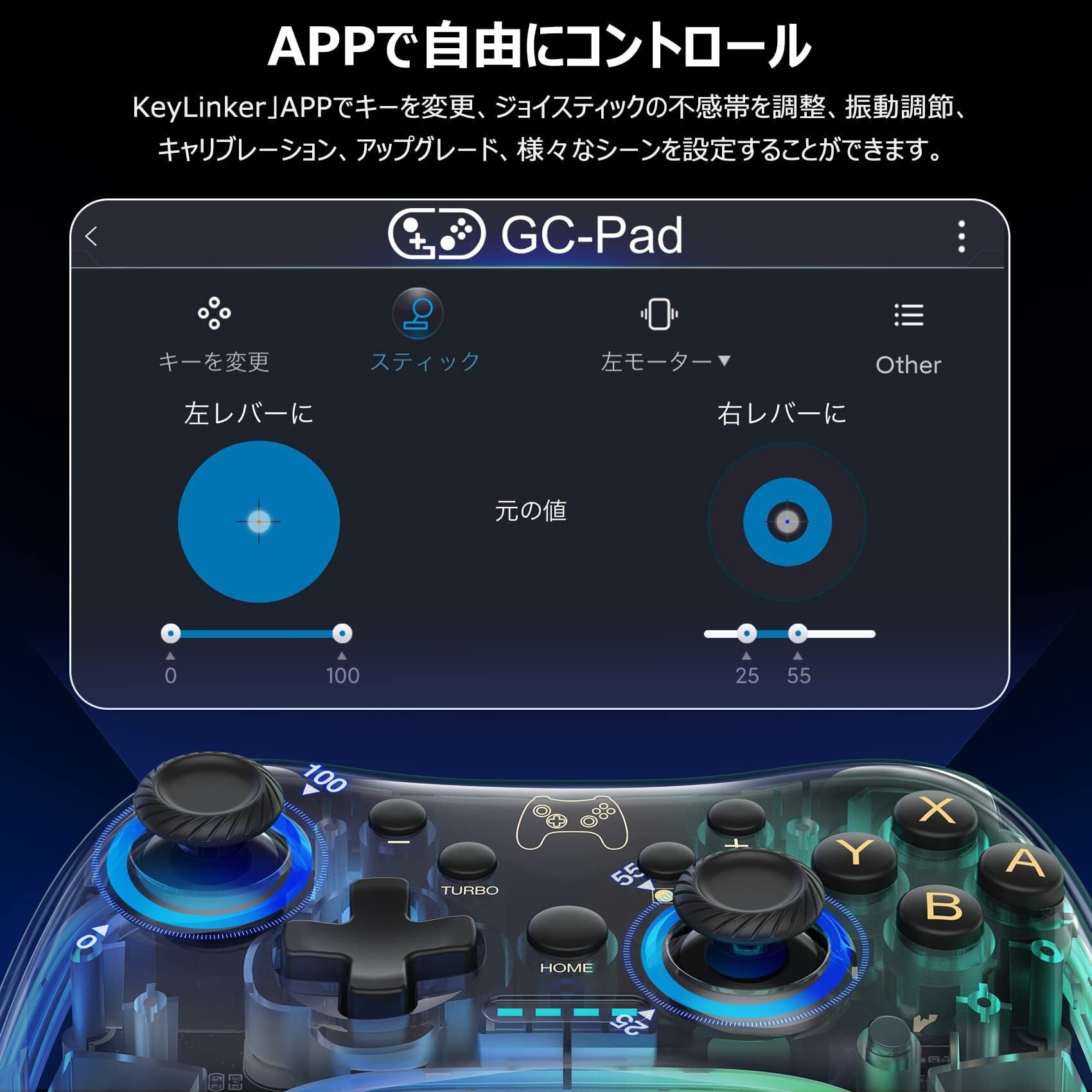 【アプリ設定対応 APPでパラメータ調節 プロコン】Switch プロコントローラーは「KeyLinker」APPでキーの互換、スティックのデッドゾーン調節、振動調整、アップグレードなど様々なパラメータを調整することができます。APPで何処でも自由に設定きるのは大変便利です。