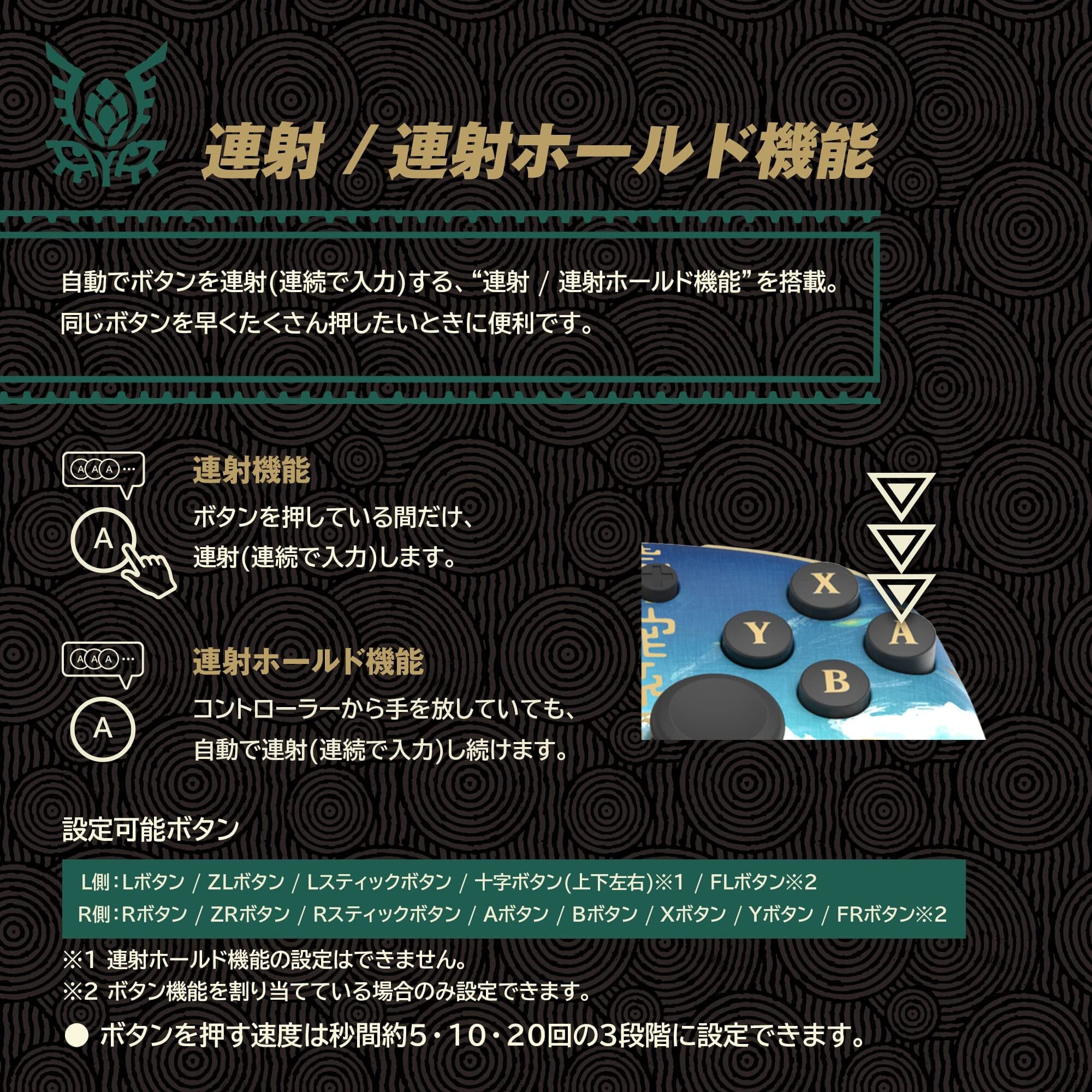 自動でボタンを連射(連続で入力)する、“連射 / 連射ホールド機能”を搭載。同じボタンを早くたくさん押したいときに便利です。