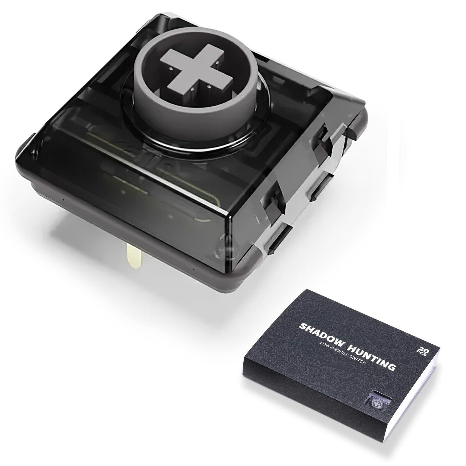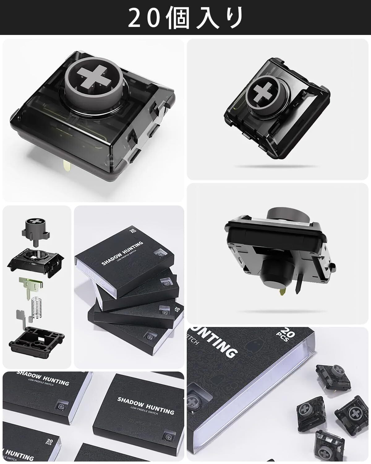 「パッケージ内容」綺麗なケースに入った Shadow Hunting ロープロファイル キースイッチが20個入りです。