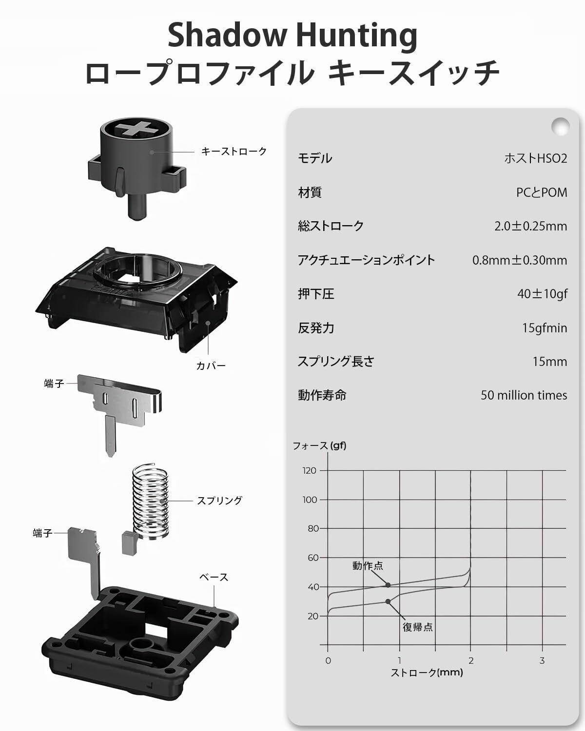 「高い耐久性と優れた光透過性」 約5,000万回の長寿命(ラボ耐久テストによる)と優れた光透過性を持っています。フルPOM素材とPCを採用し、使うほどに滑らかになり、反発力が強くなり、ノック音もクリアになります。