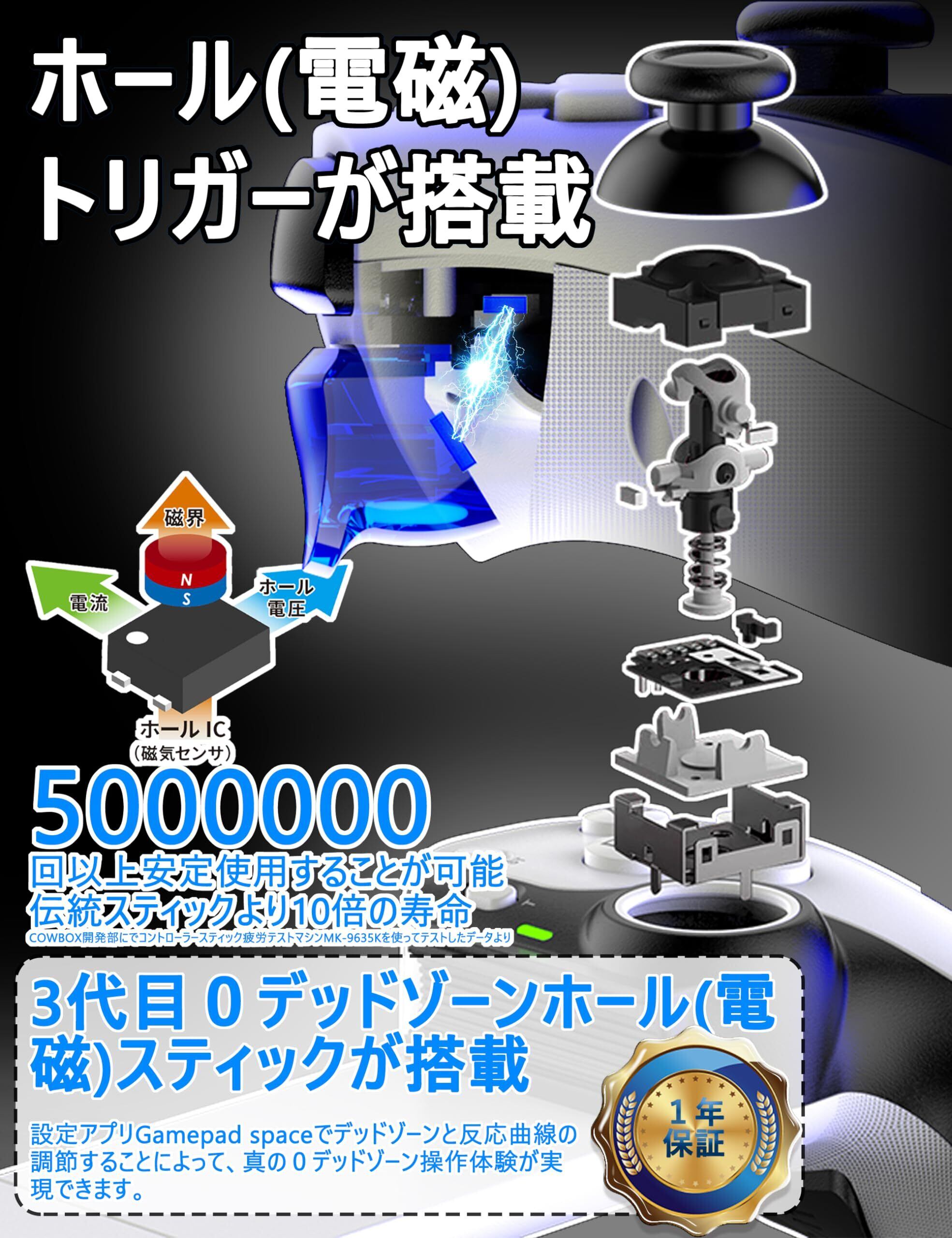 【ホールセンサー搭載3代目0デッドゾーンスティック搭載】3代目電磁スティック技術で真の0デッドゾーンスティック体験が実現できまして、スムーズさと安定性も改善されました。(初期にデッドゾーンが少し設定されたが、ゲームによって、0デッドゾーンに設定したい場合、動画を参考して設定してください。動画:youtu.be/9v8CuBUP_uw)