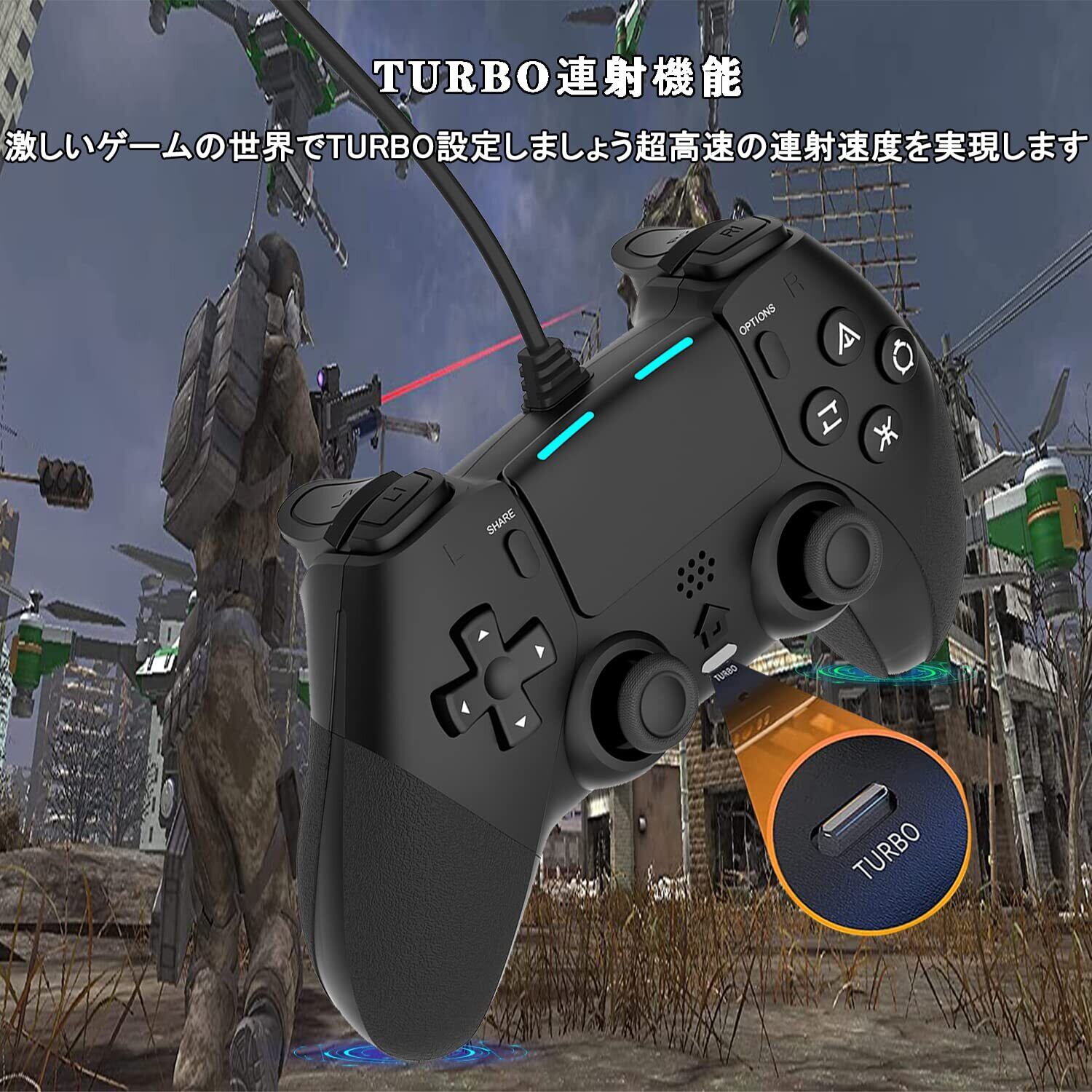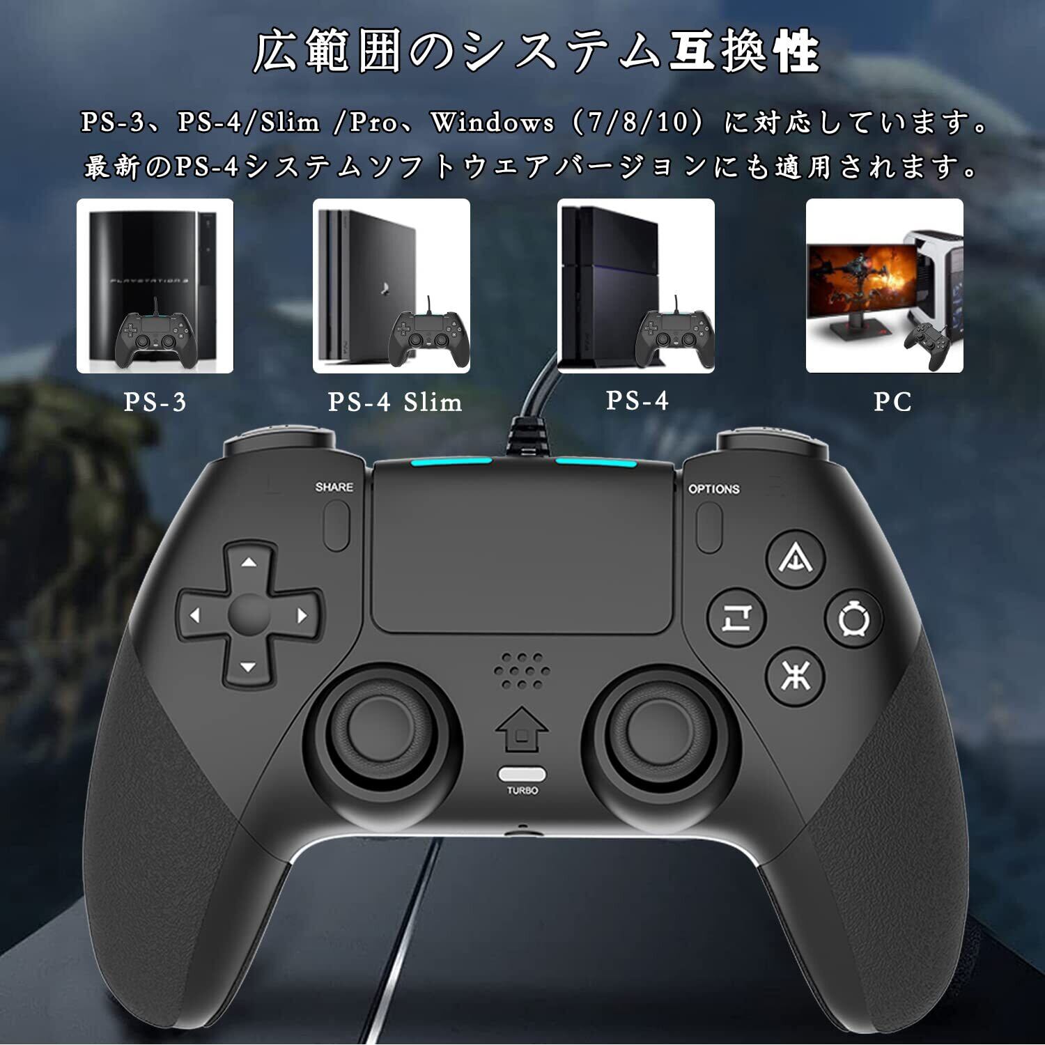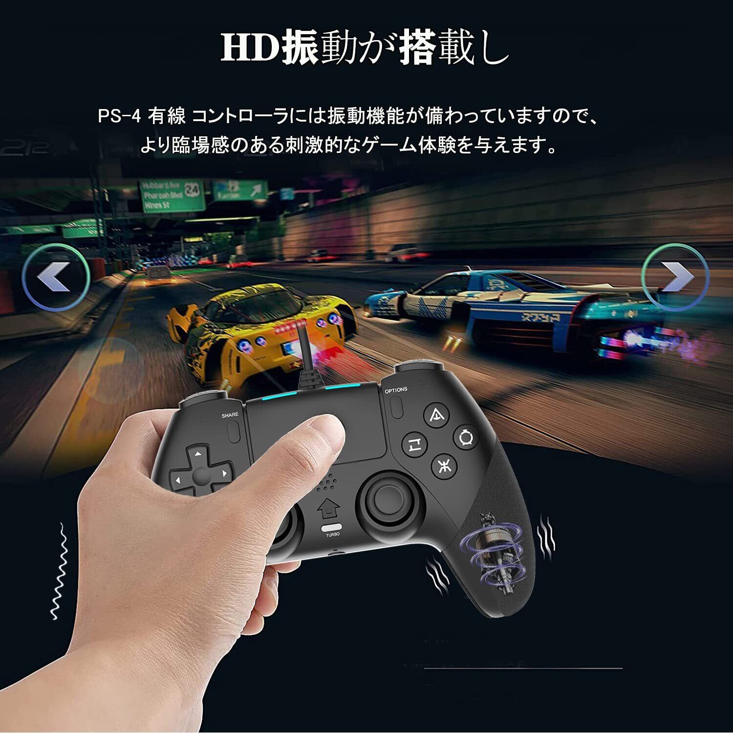 【人間工学&リアルなゲーム体験】PS-4 有線 コントローラには振動機能が備わっていますので、TURBO連射、マクロ機能、ピンホールリセット機能、LEDランプなどの機能を備えます。あなたは没入感あふれるものになり、本物のゲーム体験をもたらします。最新の人間工学に基づいた設計を採用しています、グリップの質感は指にフィットします。コントローラー自体は滑り防止シリコンを付いています、手に汗を握る場合にも落ちを防止します。軽くて握りやすい、長時間でも疲れにくく快適にゲームをプレイできます。注:本ゲームパッド、サウンド機能、ヘッドセット機能、タッチ機能はありません。