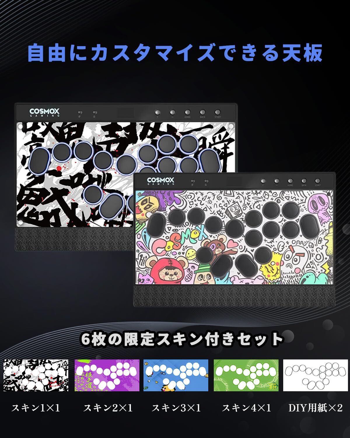 【DIYで世界に一つだけのアケコンに】 付属のアートテンプレート4枚と白地テンプレート2枚を使えば、誰でも気軽に天板デザインをカスタマイズ可能。イラストを描いたり、写真やロゴを貼ったりして、自分だけのオリジナルレバーレスコントローラーを完成できます。ホットスワップ対応なので、スイッチやキーキャップの交換も工具なしで簡単。プレイする楽しさはもちろん、“作る楽しさ”まで詰まった1台です。