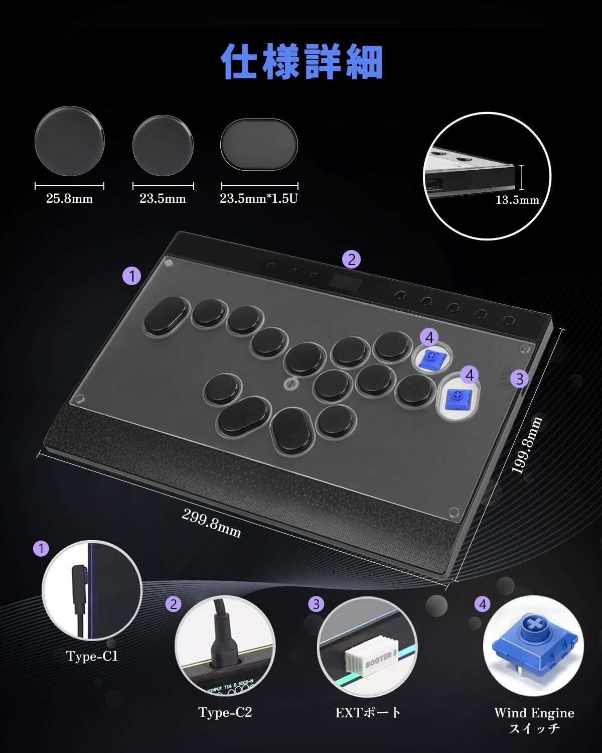 【トーナメント仕様の安心機能】 本製品はアケコンを大会で使用することも想定し、競技向けの便利機能を数多く搭載しています。2つのType-Cポートは半埋め込み式で、ケーブルの抜き差しによる破損や試合中の接触不良を防止。さらに「トーナメントロックスイッチ」を搭載しており、意図しないボタン操作を完全に防ぎます。RGBライティングのON/OFFを瞬時に切り替えられる「ライトロック」も備え、大会ルールに合わせてすぐに対応可能。安心して対戦に集中できる、まさにプロ志向のレバーレスコントローラーです。