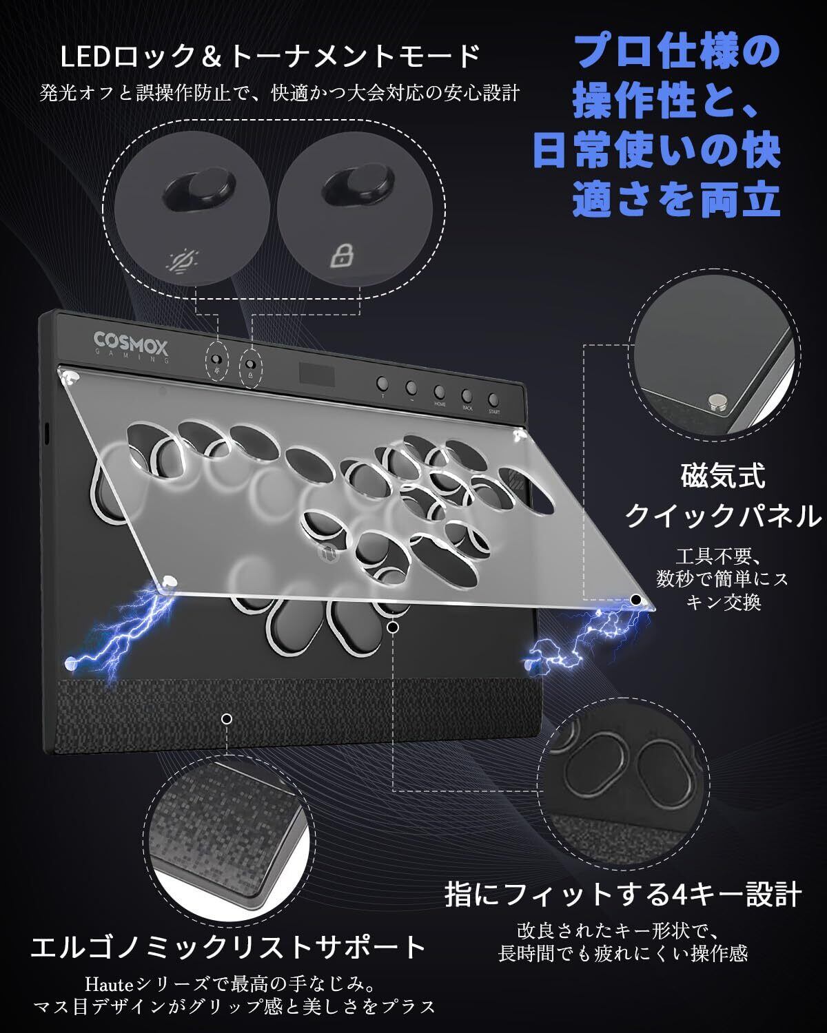 【マグネット式トップパネル、カスタマイズをもっと身近に】 C16-Sはマグネット着脱式のトップパネルを採用。背面のボタンを押すだけで簡単にパネルを外せるので、ネジ外しの面倒さがありません。強力な磁石でしっかり固定されるため、激しい操作中でもズレたり外れたりする心配は不要。パネルを交換してオリジナルデザインに変えたり、RGBリングライトのカラー・発光モード・明るさを自由に設定したりと、自分好みのレバーレスを作り上げることができます。カジュアルゲーマーから競技勢まで、幅広いスタイルに対応する1台です。