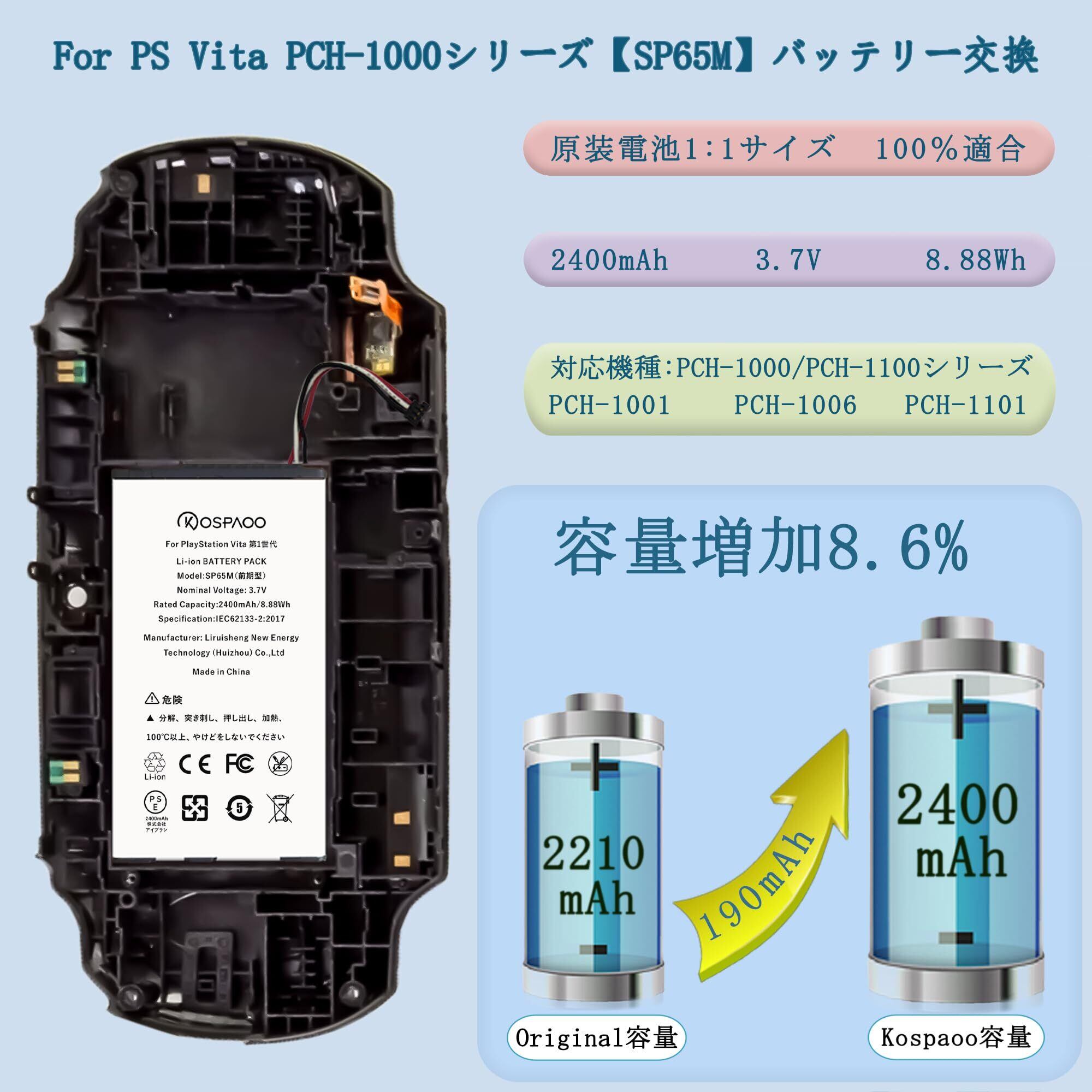 for Sony PlayStation Vita PCH-1000【SP65M前期型】バッテリー 第1世代 交換 大容量2400mAh 3.7V 増量8.6% SP65M電池 PSE認証 対応PCH-1001/PCH-1006/PCH-1100/PCH-1101機種 互換修理用 高温・低温耐性 600~800サイクル寿命 適用PS Vita PCH-1000電池【No Tool】