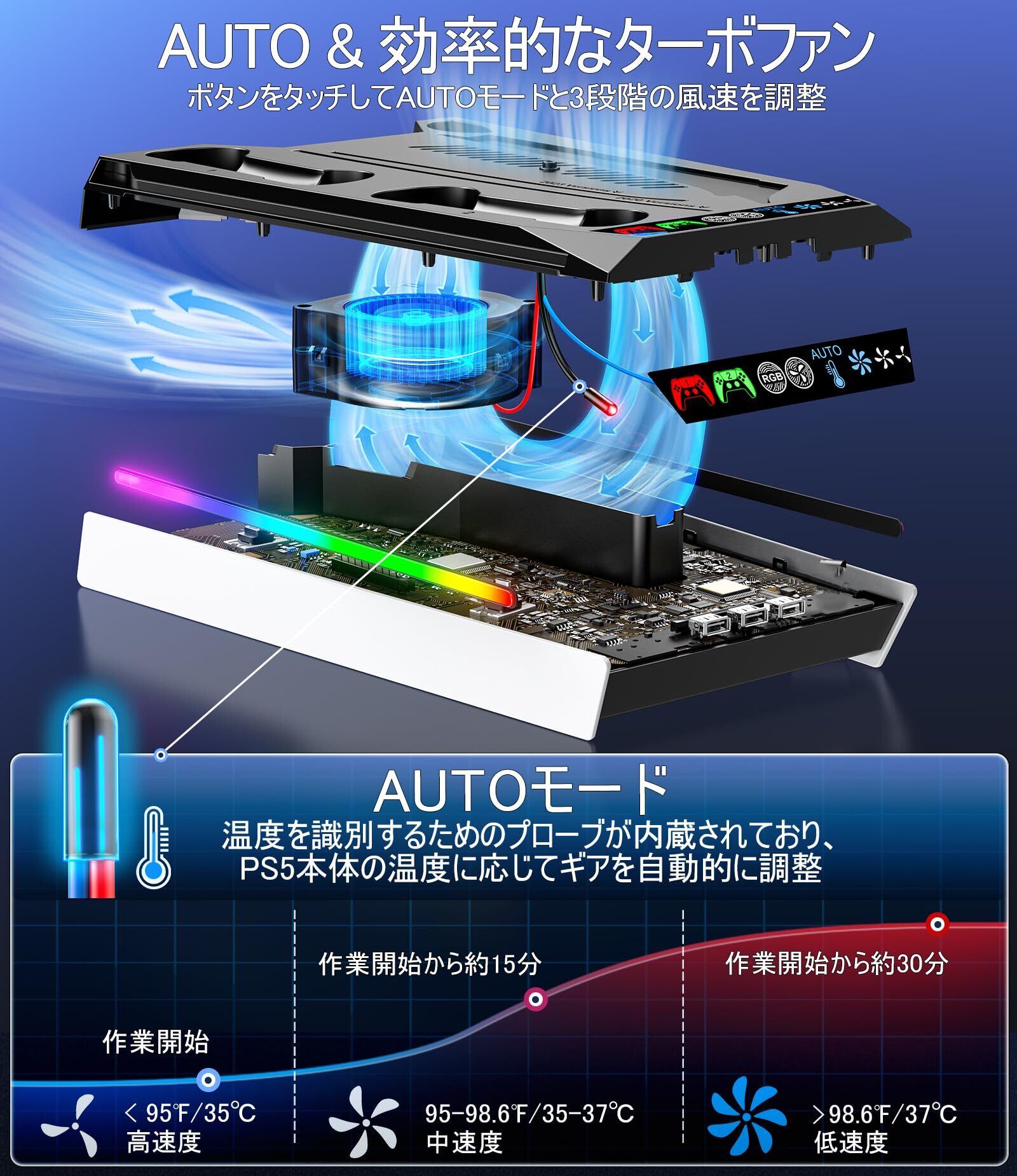 【自動モードで3段階風速調整】PS5冷却スタンドにはPS5本体の温度を識別するためのプローブが内蔵されており、PS5本体の温度に応じて、自動でファンの回転速度を高速(PS5本体の温度>37℃)、中速(PS5本体の温度約35-37℃)または低速(PS5本体の温度<35℃)に切り替えます。
