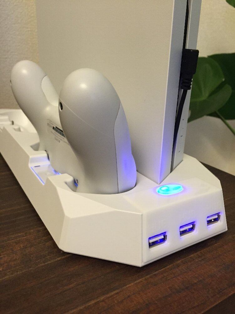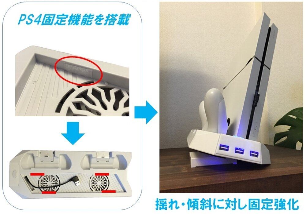 機能2:クーリングファンがある他社製と同型ですが、検証結果や他社品のレビューからPS4本体の数倍の騒音を発生させ、スタンバイ中にコントローラーを充電する際にもOFFに出来ず騒音を発生し続けるため本品ではファンを除去しました。ファン用の吸気口と底面スリットを完備しているためPS4本来のファンによる放熱性は十分確保しております。