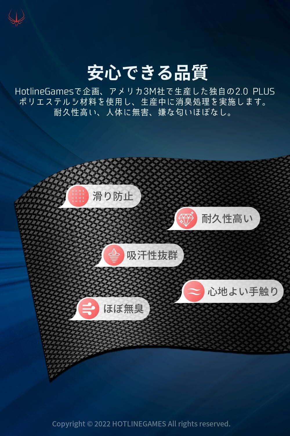 【吸汗力&滑り防止効果抜群】HotlineGamesより企画され、米国3M社で生産した独自の2.0 PLUSポリエステルシ材料を使用しております。驚きほどの強い吸水性を実現でき、ゲーム中に手汗や水の影響を受けなく、滑り防止効果が抜群です。