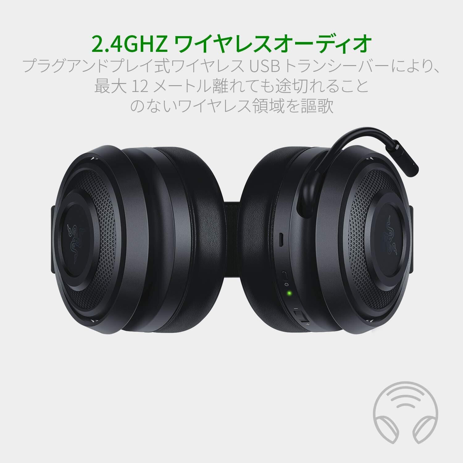 2.4GHz ワイヤレスオーディオ:タイムラグのないハイファイゲーミングオーディオ。プラグアンドプレイ式ワイヤレス USB トランシーバーにより、最大 12 メートル離れても途切れることのないワイヤレス領域を謳歌。
