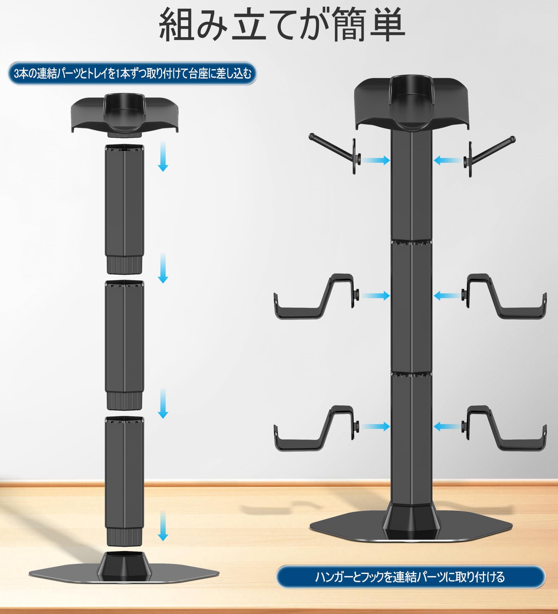 【組み立て簡単】ゲームコントローラー 収納ラックは組み立て式で、工具を使わずに簡単に設置できます。連結パーツを1本ずつ取り付けて土台に差し込み、コントローラーフックとトレイを連結パーツに取り付けるだけです。
