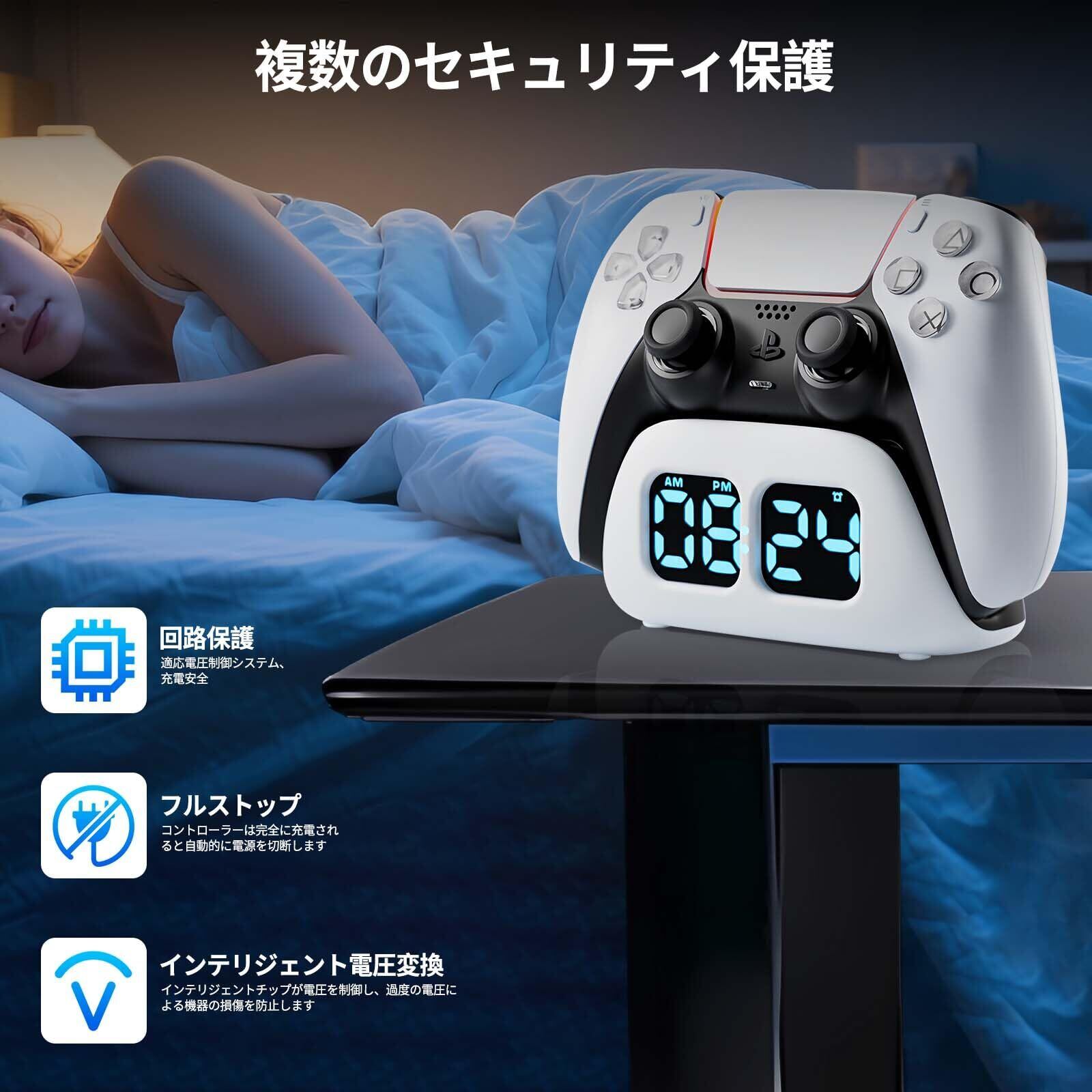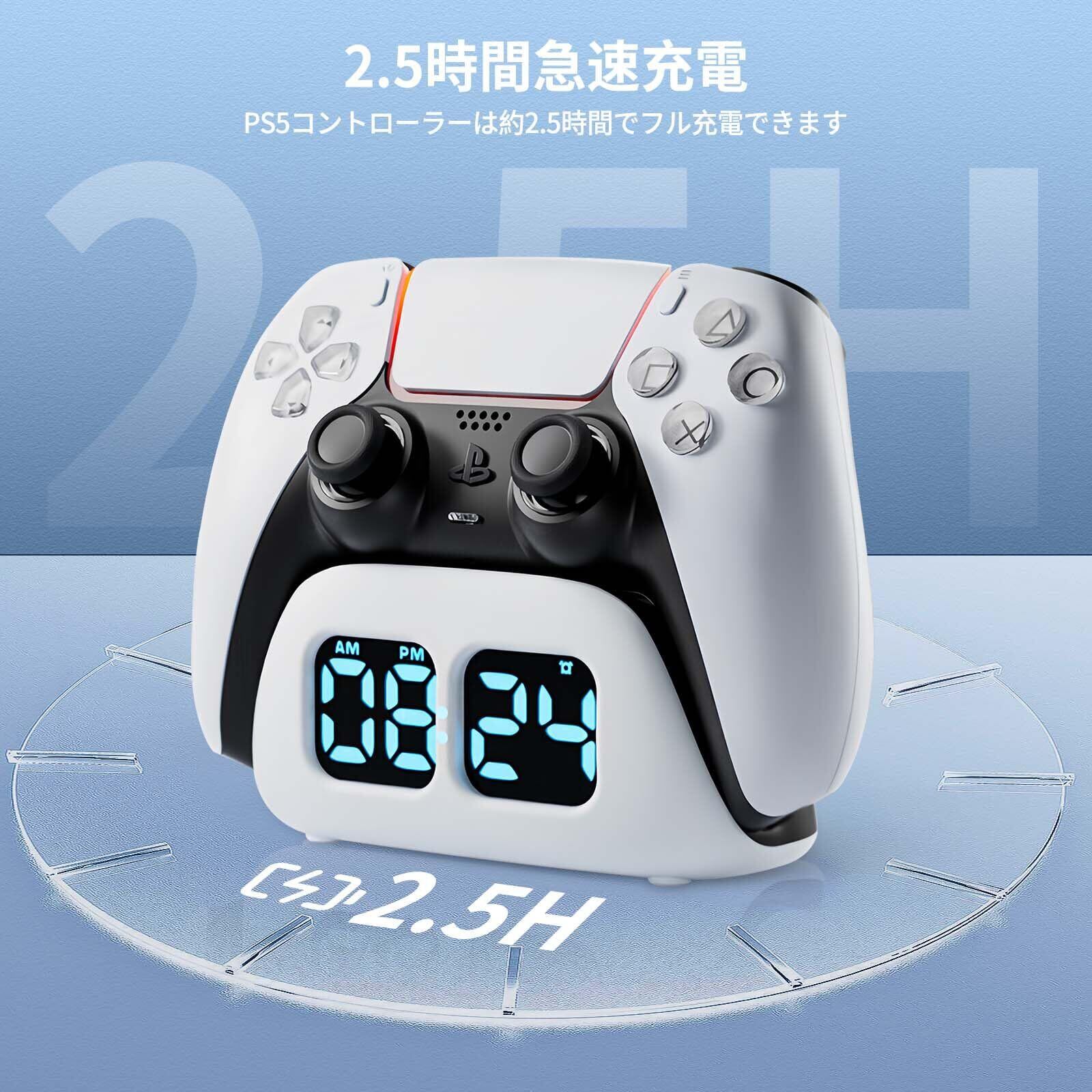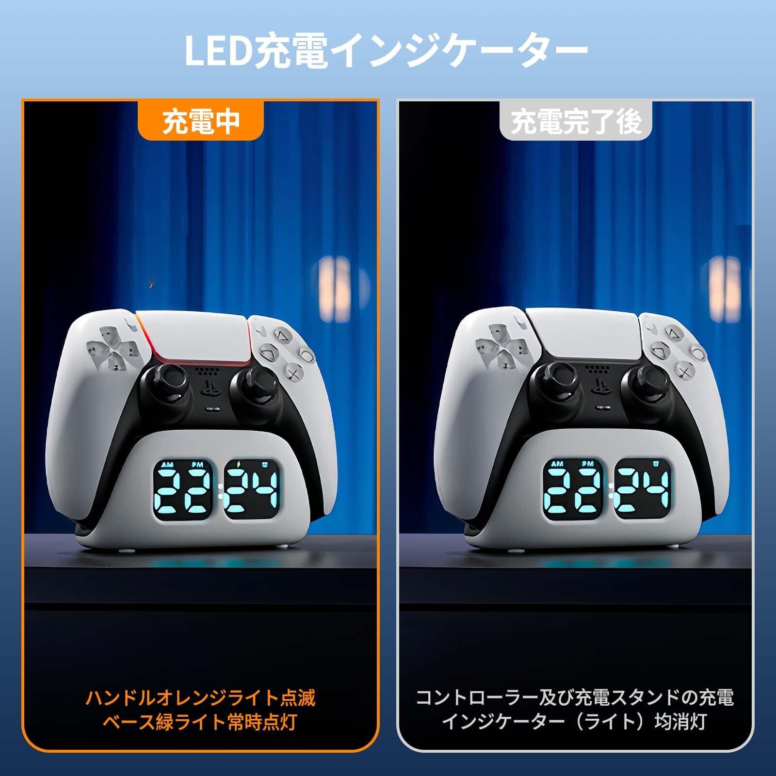 【スマート充電と時間管理】この充電スタンドはPS5用コントローラーに完璧に適合します。充電機能と電子時計機能を一体化しています。コントローラーの充電中は収納ススタンドを確保できるため、ゲームスペースを節約できます。プレステ5用充電器には電子時計ディスプレイが搭載されており、いつでも充電時間を確認できます。
