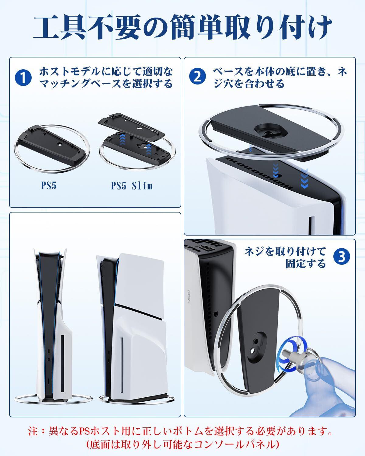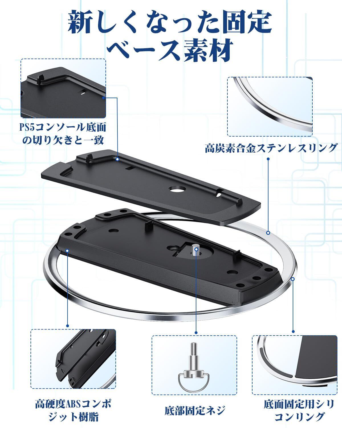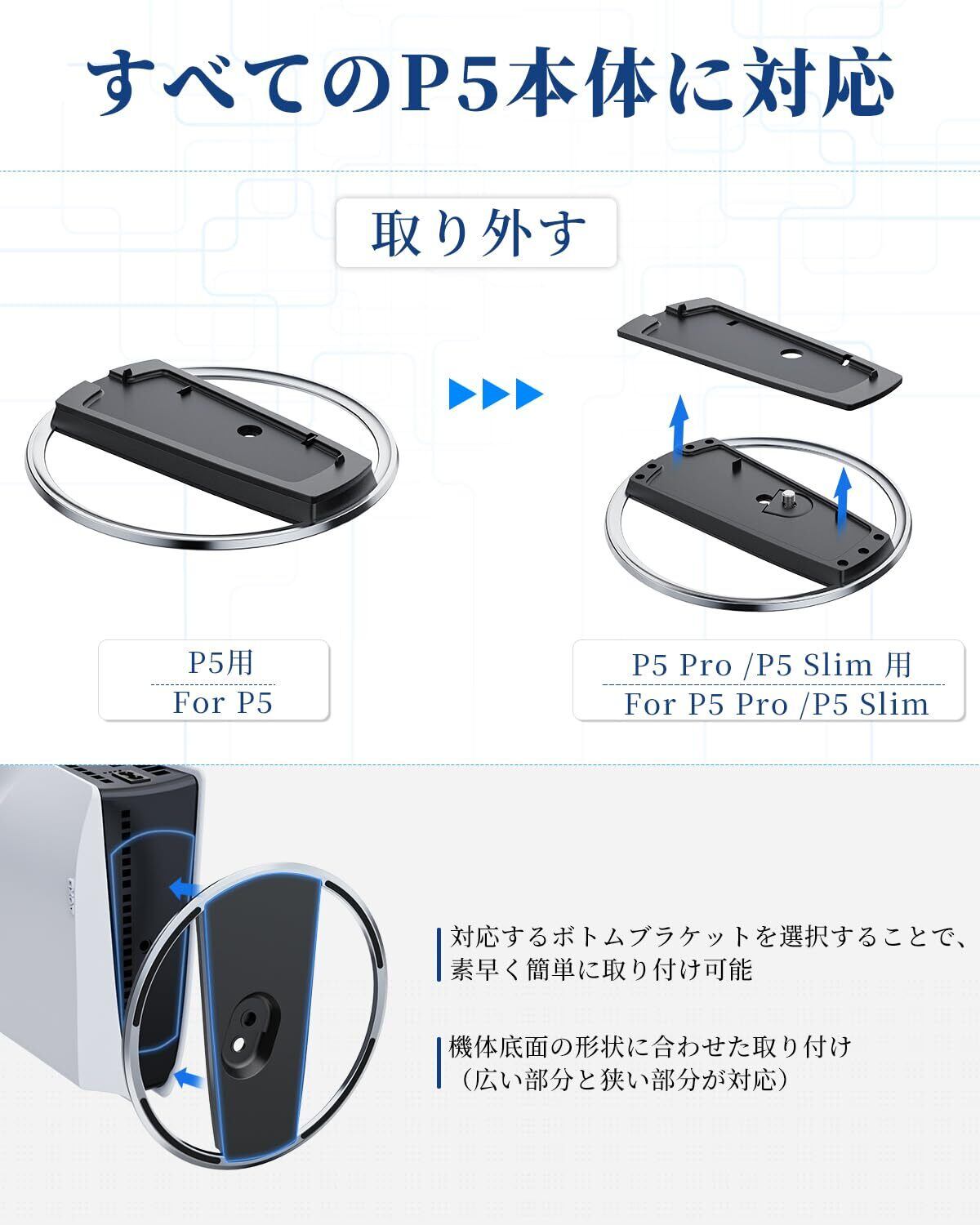【P5 Pro/P5/P5スリム専用スタンド 】:底面には滑り止めのシリコンリング、本体固定用のネジが付属。 このP5スリム用スタンドは普通のプラスチック製スタンドを超え、場所を取らないだけでなく、P5スリムとP5コンソールをより安定した筐体にし、不慮の衝突や滑りを心配する必要がありません。