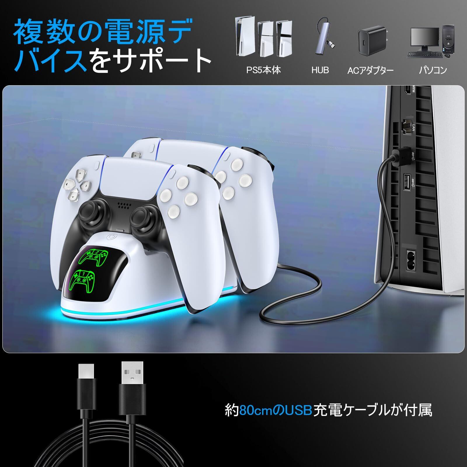 【限定セール】PS5 コントローラー 充電スタンド 2台同時急速充電 置くだけ充電可能 過充電防止 RGBライト搭載 日本語取扱説明書付き PS5 周辺機器 Edge兼用 USB-Cケーブル付属 白色