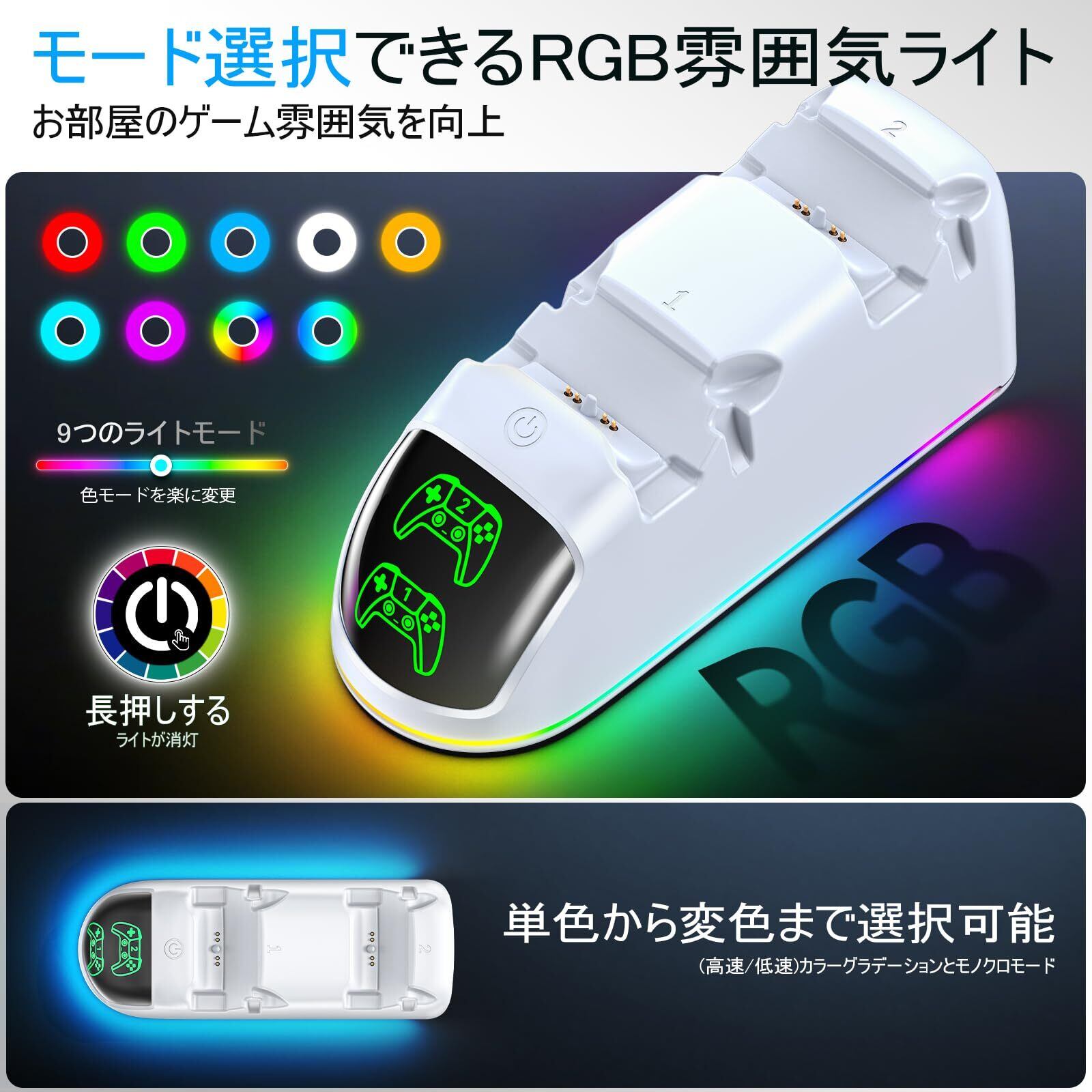 【雰囲気向上させるRGBライト】デュアルセンス充電スタンドは9つのモード選択できるRGBライトがあります。イルミネーションカラーは単色から変色まで選択できます。ライトが不要なときはライトスイッチを長押しすると雰囲気ライトが消灯します。