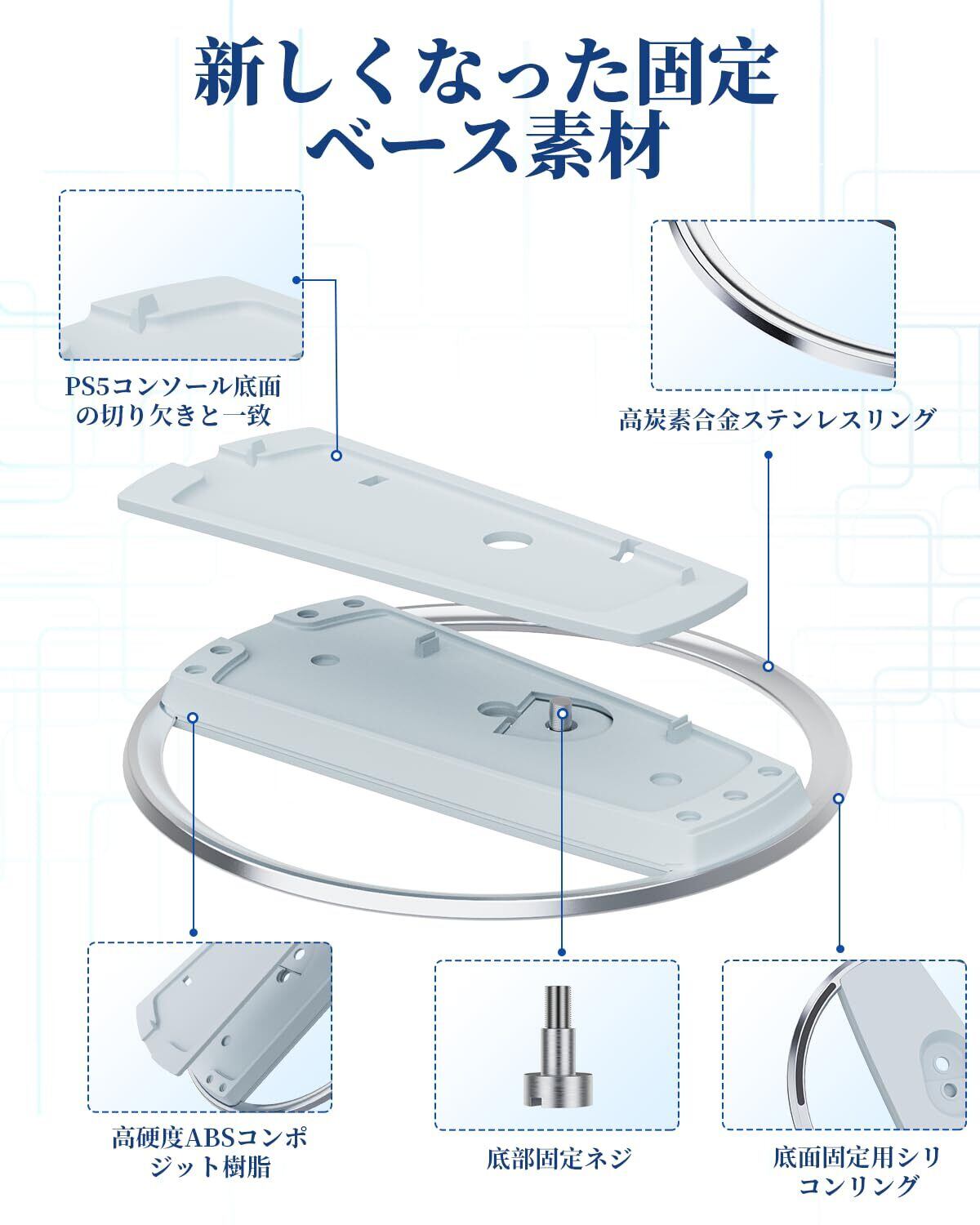 【高品質の素材で丁寧に作られた】:当社のP5 Pro/P5コンソールアクセサリーは高品質の素材で丁寧に設計されています。 リングは高炭素合金ステンレス鋼リングを採用し、硬くて耐磨耗性に優れ、表面は滑らかで美しいです;センターベースは高硬度ABS複合樹脂を採用し、耐久性とサポート力を強化します。 また、高品質のABSは耐腐食性、耐熱性、放熱性に優れ、無臭です。 PS5のスタンドとしてだけでなく、使用時にゲーム機の放熱機能を最適化し、長時間のゲーム中に最高のパフォーマンスを発揮し、ゲーム機の寿命を延ばすパフォーマンスエンハンサーでもあります。