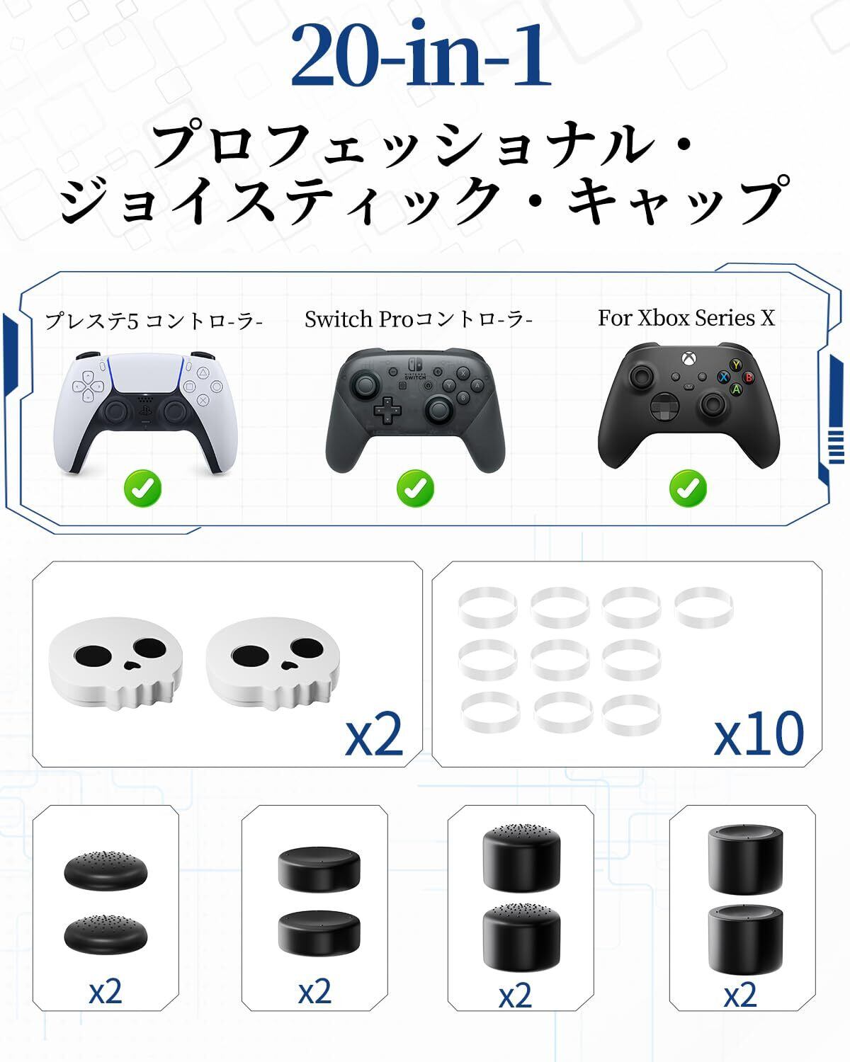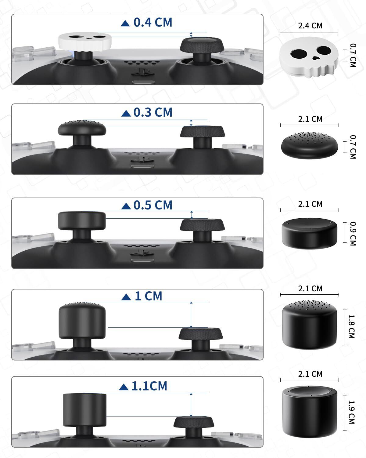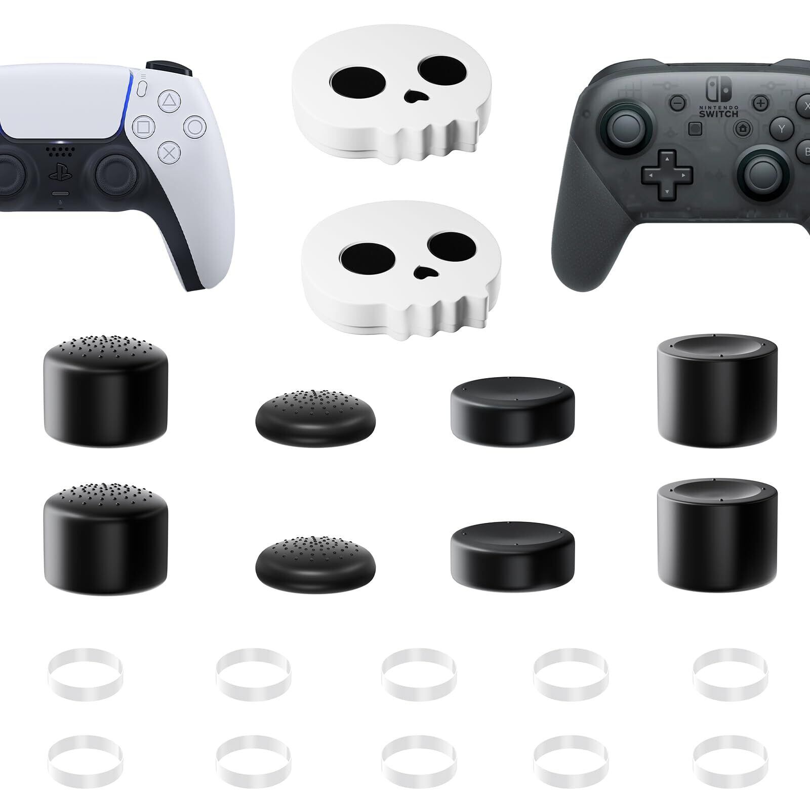 【 様々な高さと接触面】: このセットには、4つの高さと2つの接触面のジョイスティックキャップ(合計8個、黒)、2つの頭蓋骨ジョイスティックキャップ(白)、10個の摩擦防止ジョイスティックリング(白半透明)が含まれています。