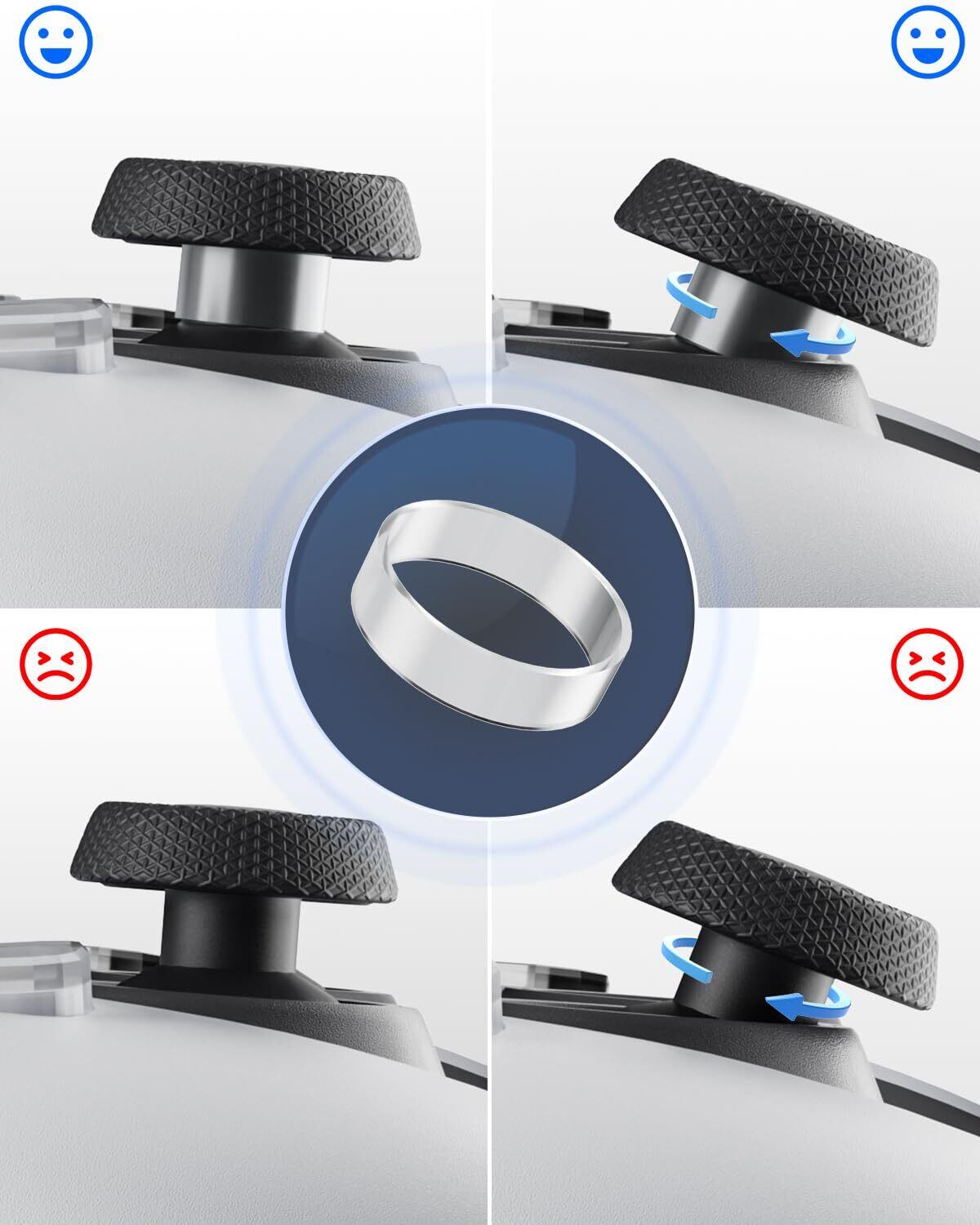 【 コントローラジョイスティックキャップ材質】:耐摩耗性、無臭シリコン製、快適な手触りと操作性、使用時の手と親指の疲労を軽減します。紫外線や湿気、経年劣化に強く、さまざまな環境で保管できます。ジョイスティック底部の磨耗やズレを防止するため、白い半透明のジョイスティック保護リング(10個付属)を取り付けることができます。装着後は、ジョイスティック底面周辺を摩耗や色落ちから保護します。
