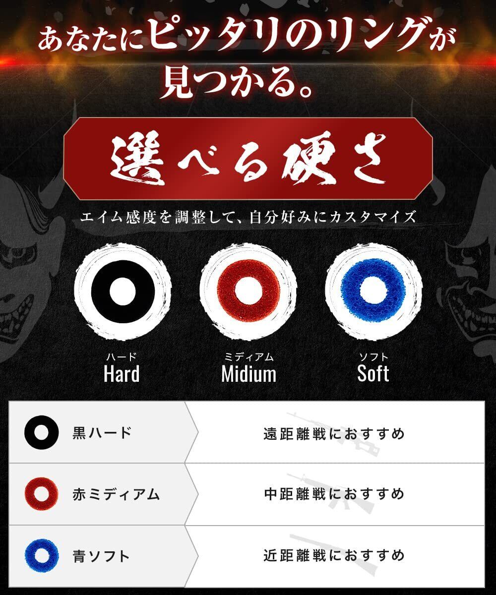 【3種類の硬さで使い比べ】鬼エイムでは、「Hard」「Midium」「Soft」の3種類の硬さを用意しています。硬くなるにつれてスティックの可動域が狭まり、より細かな操作が可能になります。各種類2個ずつ封入されているため、消耗を気にせずガンガンプレイに使用できます。