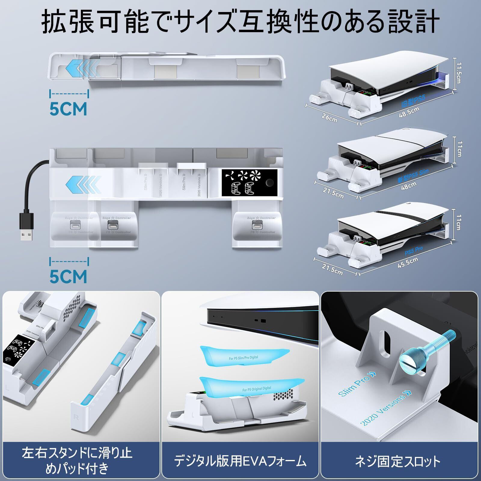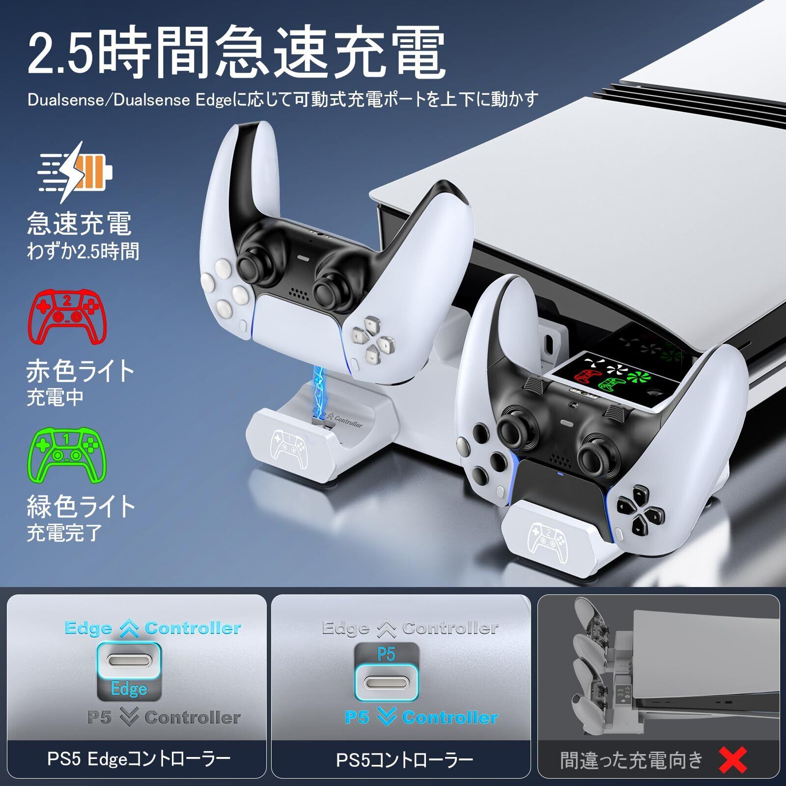 【幅広い互換性】PS5横置きスタンドは初期型PS5、新型PS5 SlimとPS5 Proの通常版とデジタル版に対応できます。PS5コントローラー充電器はPS5 コントローラーとPS5 Edgeコントローラーを充電できます。